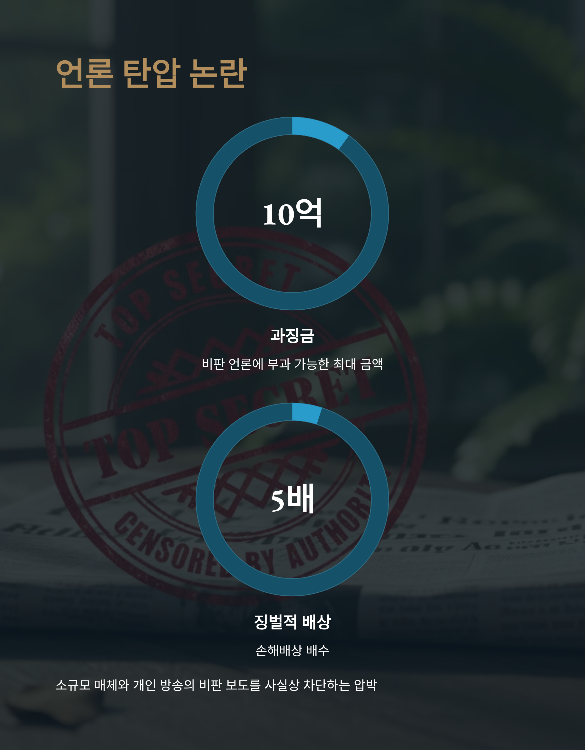 특히 정부에 비판적인 언론이나 유튜브 채널에 최대 10억 원의 과징금과 5배의 징벌적 손해배상을 물리겠다는 법안은 '비판의 자유'를 심각하게 위축시킬 수 있습니다.