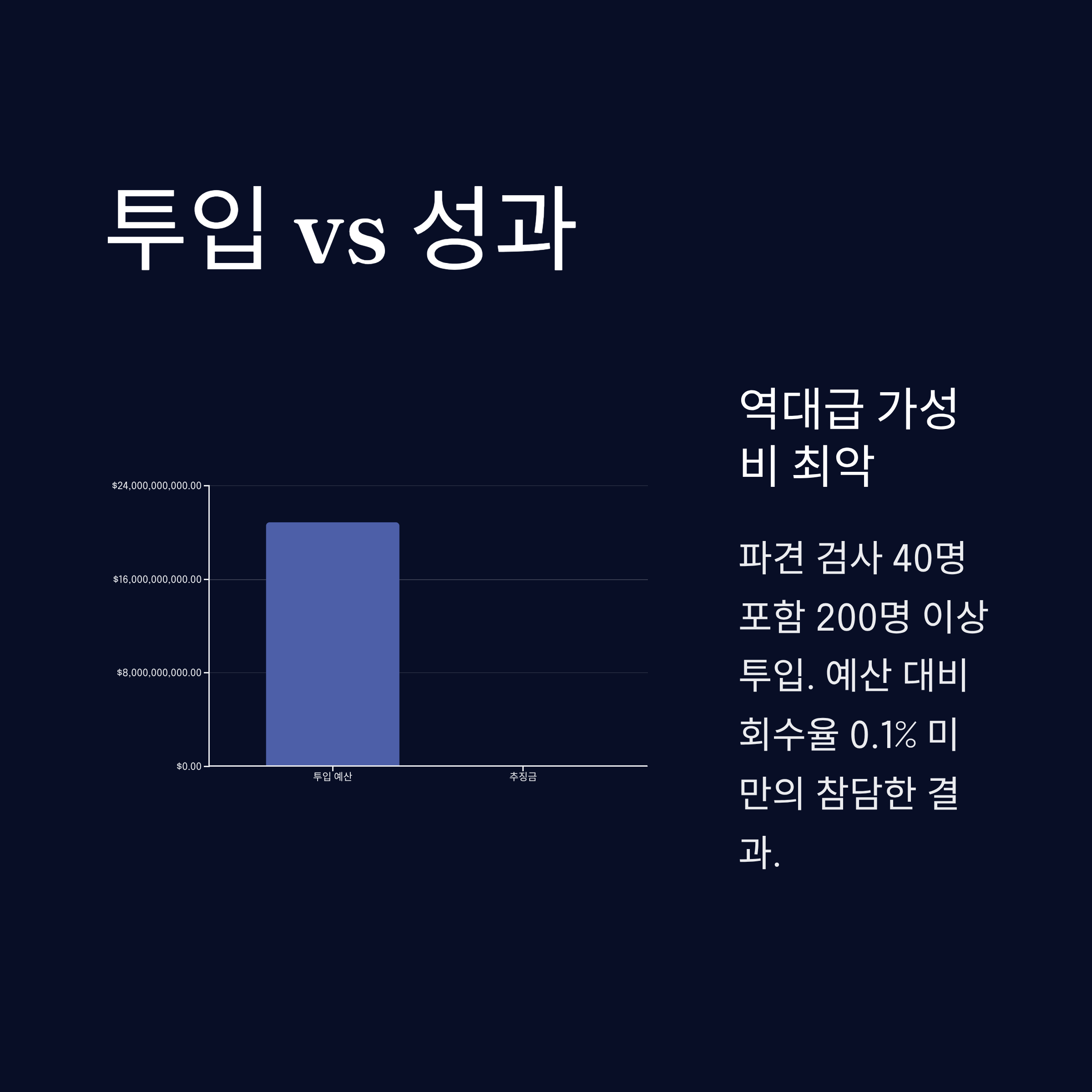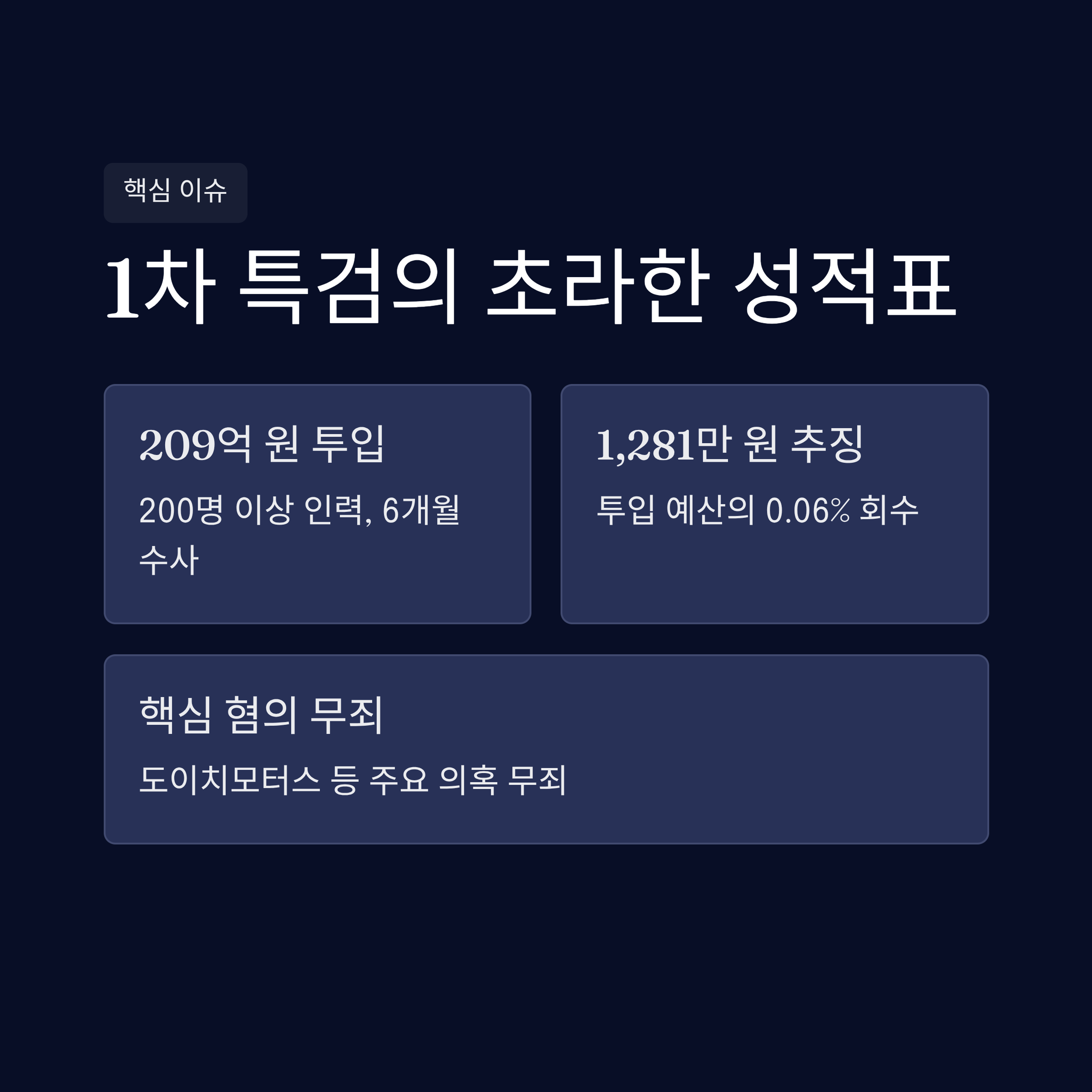천문학적 혈세 낭비: 파견 검사 40명 등 200명 이상의 인력과 209억 원의 예산을 투입했으나, 성과는 투입 예산의 0.1%에도 미치지 못했습니다.