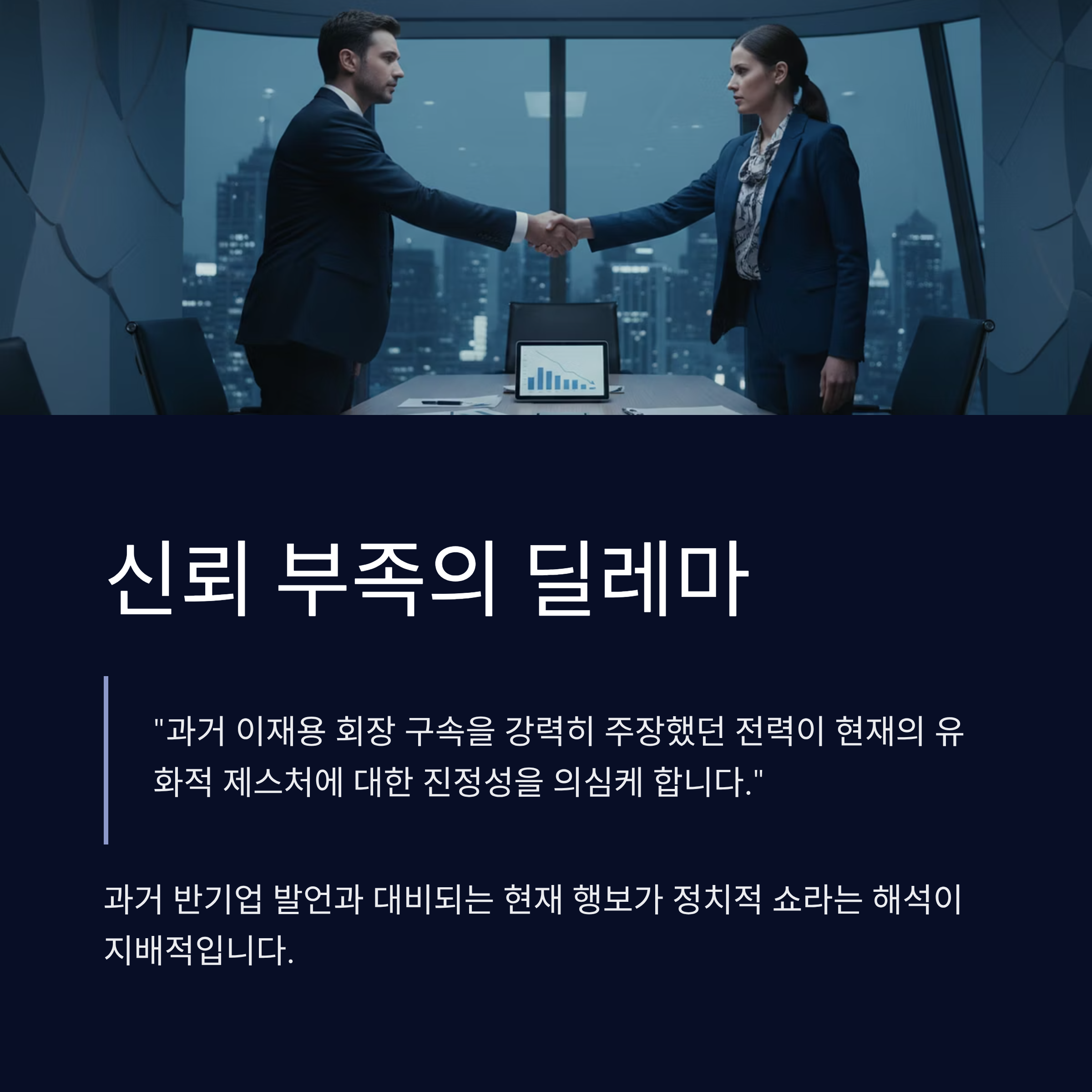신뢰 부족 문제: 과거 반기업 발언과 대비되는 현재의 행보가 6월 지방선거를 겨냥한 정치적 쇼라는 해석이 지배적이며, 진정성에 대한 의문이 제기됩니다.