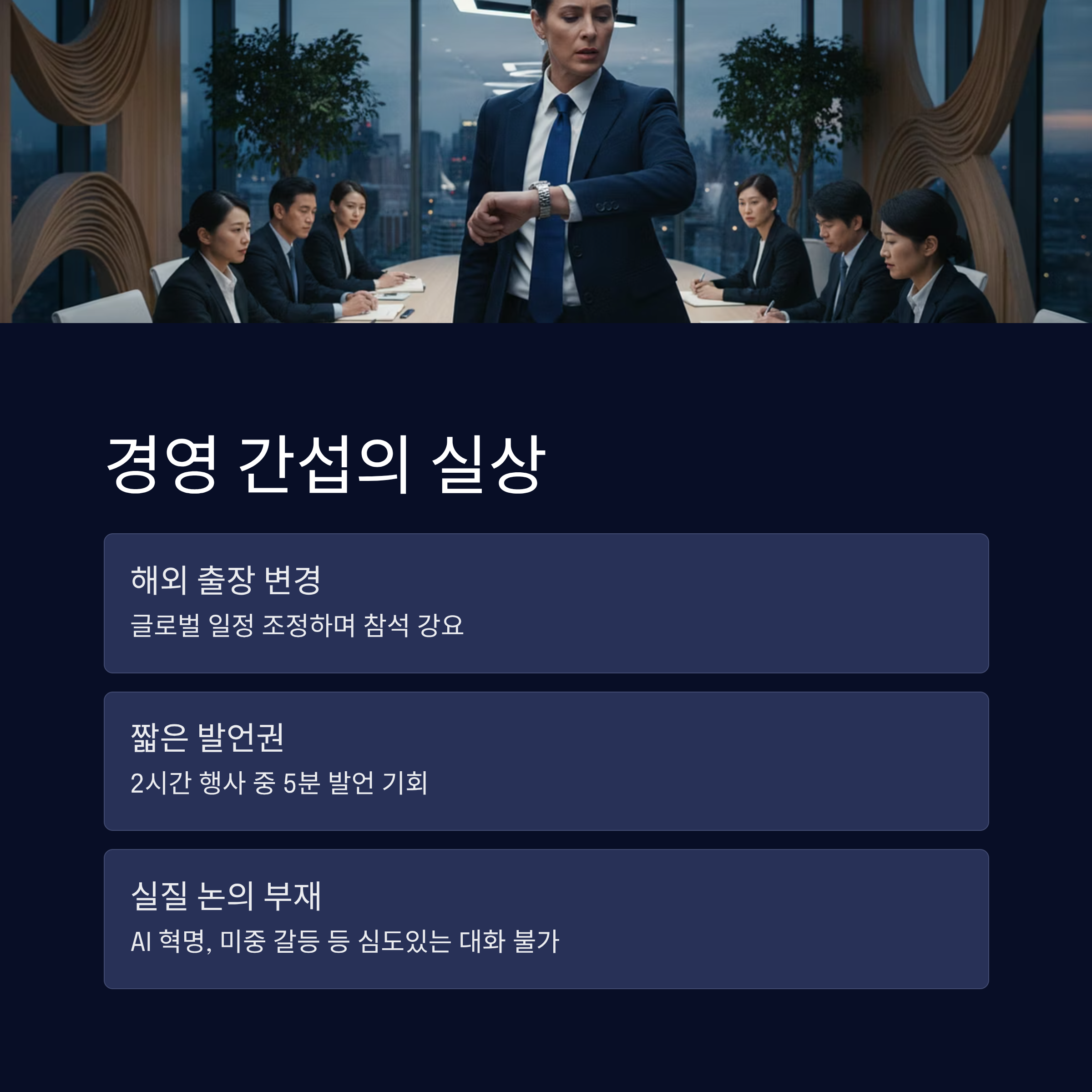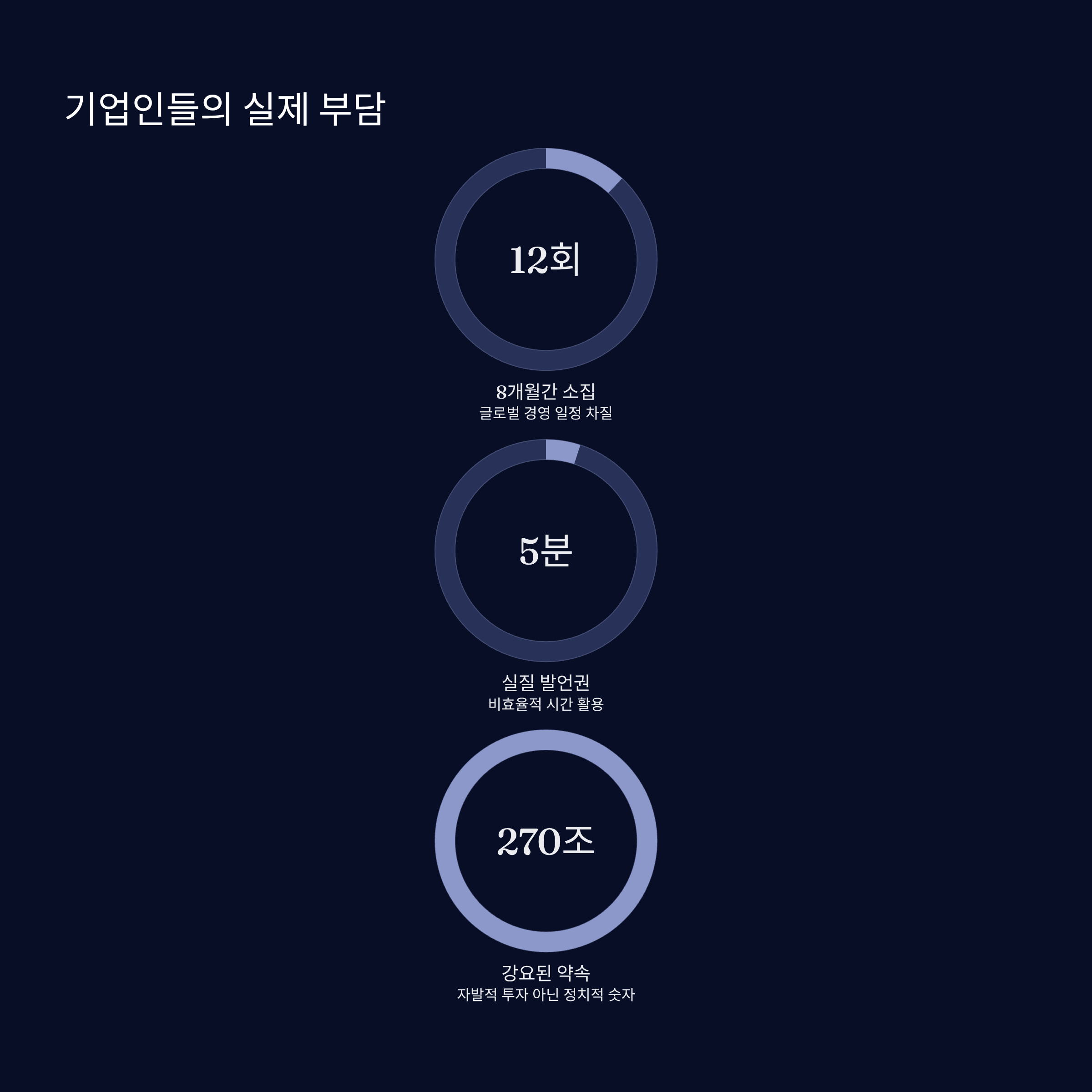 | A2. 빡빡한 글로벌 경영 스케줄 속에서 잦은 호출은 업무에 지장을 주기 때문입니다. 특히 이재용 회장의 경우 해외 출장까지 조정하며 참석해야 했고, 행사 시간 대비 발언 기회는 5분 내외로 적어 비효율적인 보여주기식 행사라는 불만이 큽니다. |