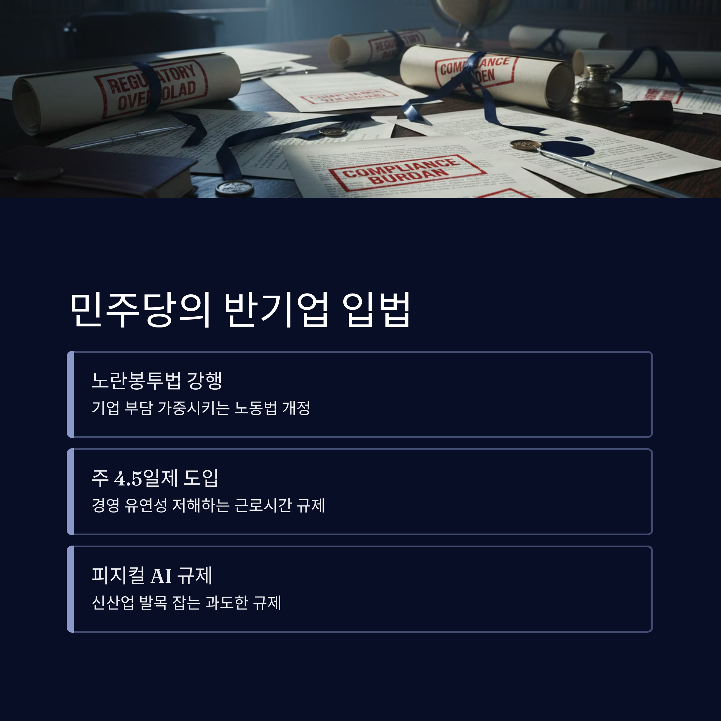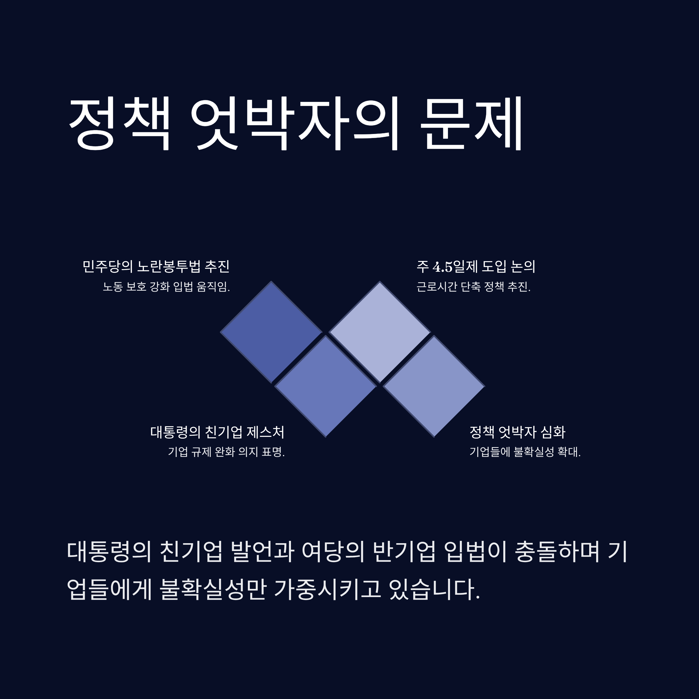 정책 엇박자: 대통령은 친기업 제스처를 취하나, 여당인 더불어민주당은 노란봉투법, 주 4.5일제 등 기업 부담을 가중시키는 입법을 추진하며 정책 혼선을 야기합니다.