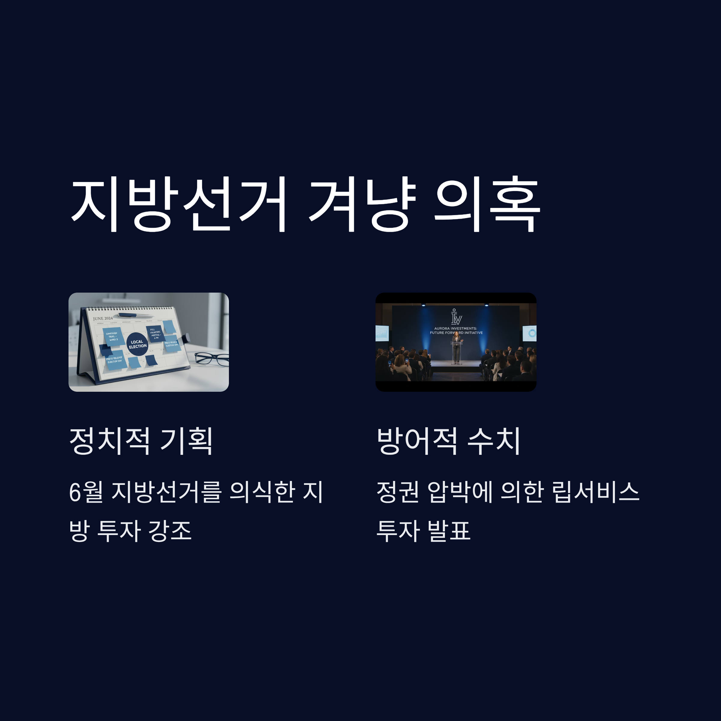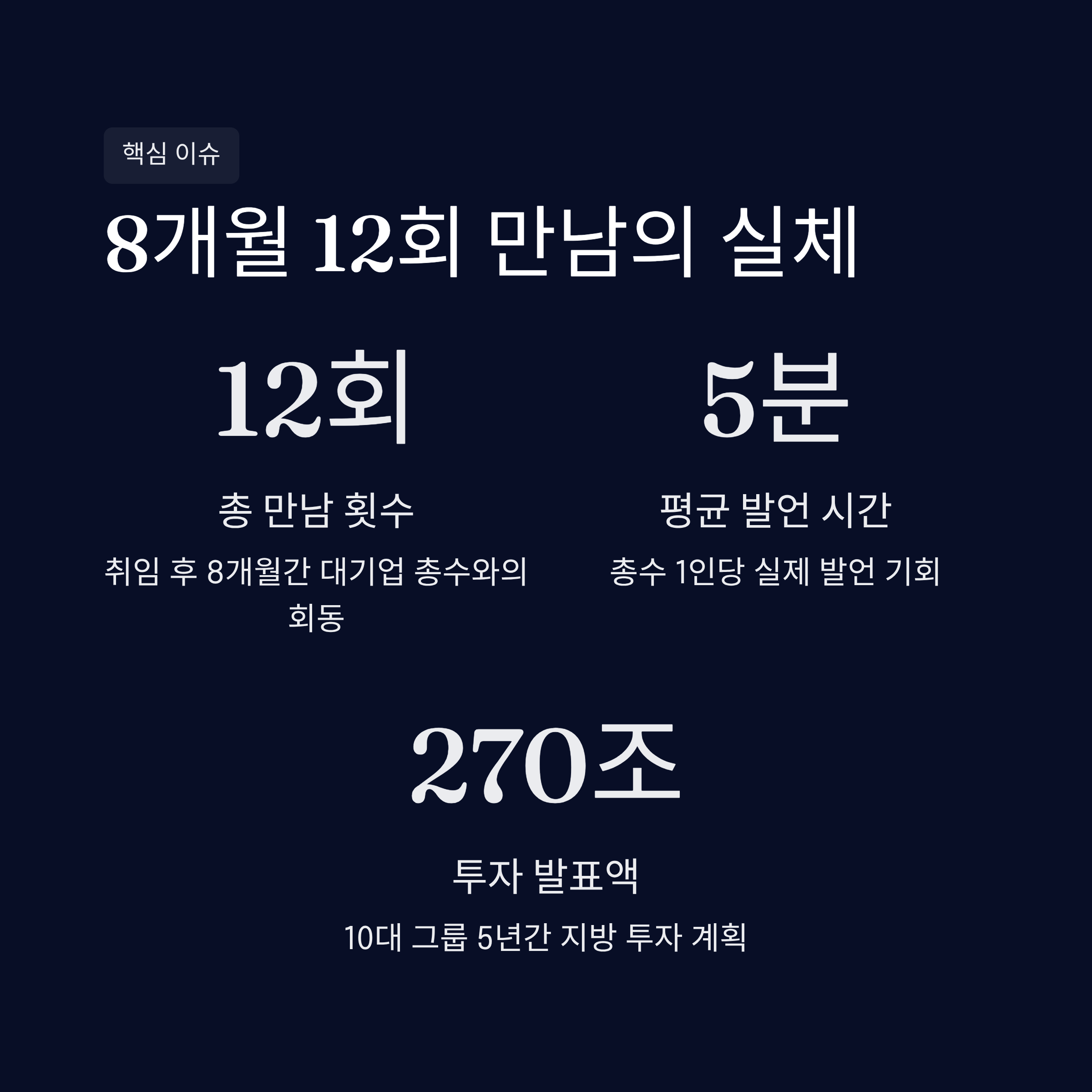 보여주기식 투자 발표: 10대 그룹이 발표한 5년간 270조 원 지방 투자는 기업의 자발적 전략이라기보다 대통령을 위한 '립서비스' 성격이 짙다는 비판을 받습니다.