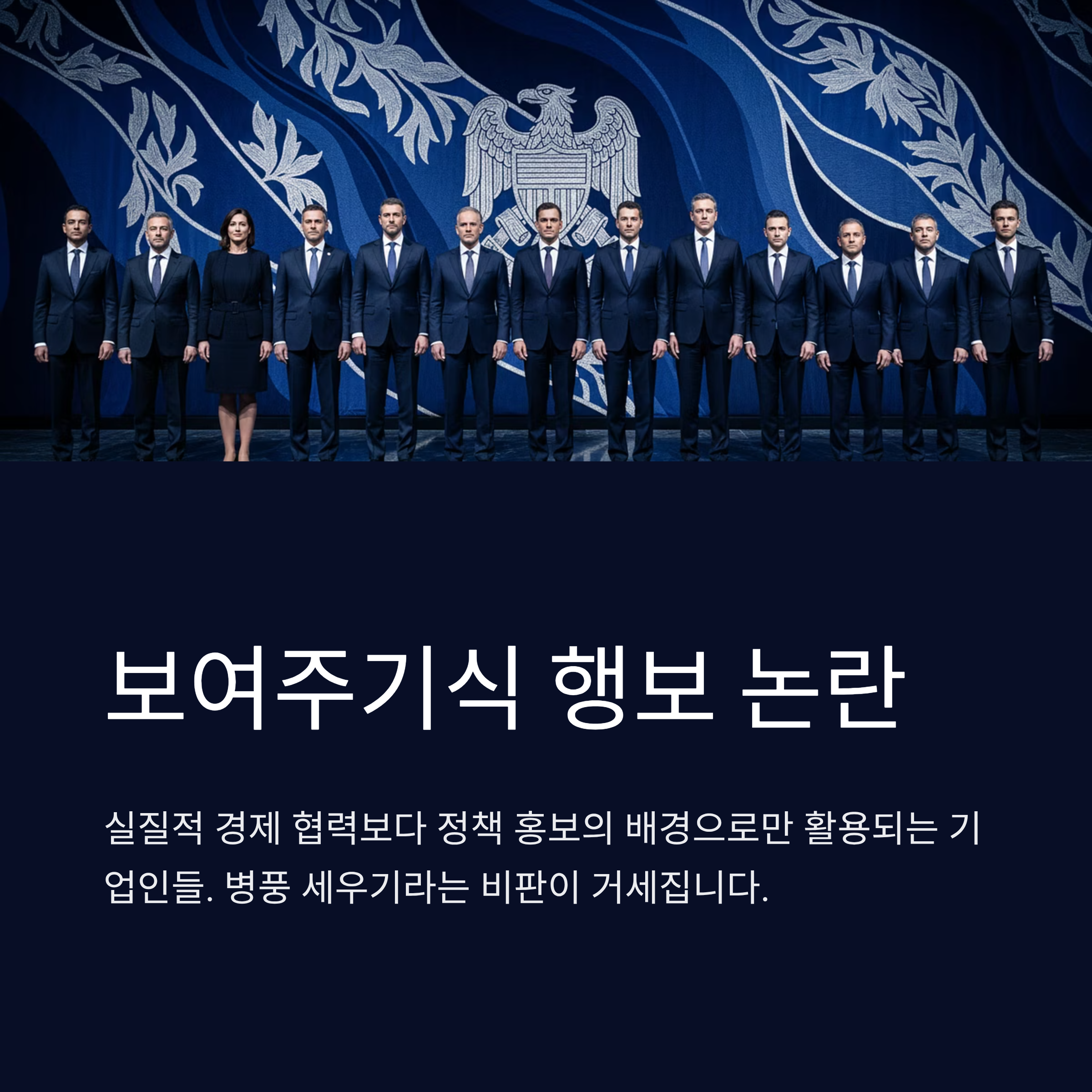 현 정부 출범 8개월 만에 12차례나 이루어진 대기업 총수 소집은 과거 '친기업'을 표방했던 이명박 전 대통령의 취임 후 3년간 6회 기록을 압도적으로 상회합니다. 문제는 빈도가 아니라 '밀도'입니다. 이재용 삼성전자 회장이 해외 출장 대신 행사에 참석해 "당연히 와야지요"라고 답한 장면은 자발적 협력보다 권력에 의한 '팔 비틀기'로 해석됩니다. 2시간 행사 중 총수 발언권이 5분에 불과했던 점은 AI 혁명이나 미중 갈등 같은 심도 있는 논의가 불가능했음을 시사하며, 이는 기업인을 정책 홍보의 배경인 '병풍'으로 소모한다는 비판의 확실한 근거가 됩니다.