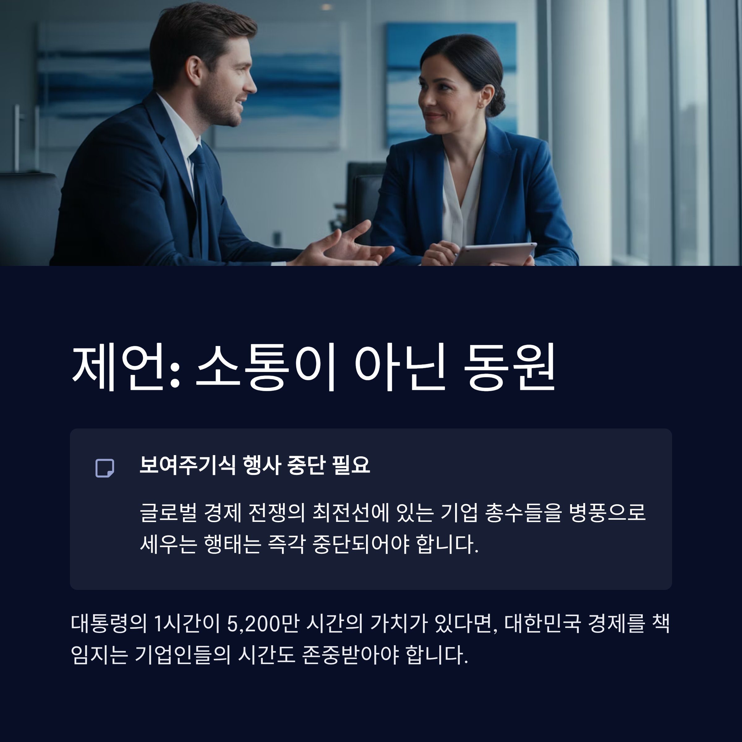 이재명 정부의 잦은 기업인 호출은 진정한 '소통'이라기보다 권력을 이용한 '동원'에 가깝습니다. 글로벌 경제 전쟁의 최전선에 있는 기업 총수들을 8개월간 12번이나 불러내어 5분 발언권을 주고 병풍으로 세우는 행태는 즉각 중단되어야 합니다. 대통령의 1시간이 5,200만 시간의 가치가 있다면, 대한민국 경제를 책임지는 기업인들의 시간 또한 존중받아야 마땅합니다. 정부의 역할은 보여주기식 행사가 아니라, 규제 혁파와 확실한 인센티브 제공 등 기업이 뛸 수 있는 운동장을 만드는 것입니다. 정청래 대표의 민주당과 조율되지 않은 헛구호는 멈추고, 실질적인 기업 지원책과 일관성 있는 정책을 내놓아야 할 때입니다.