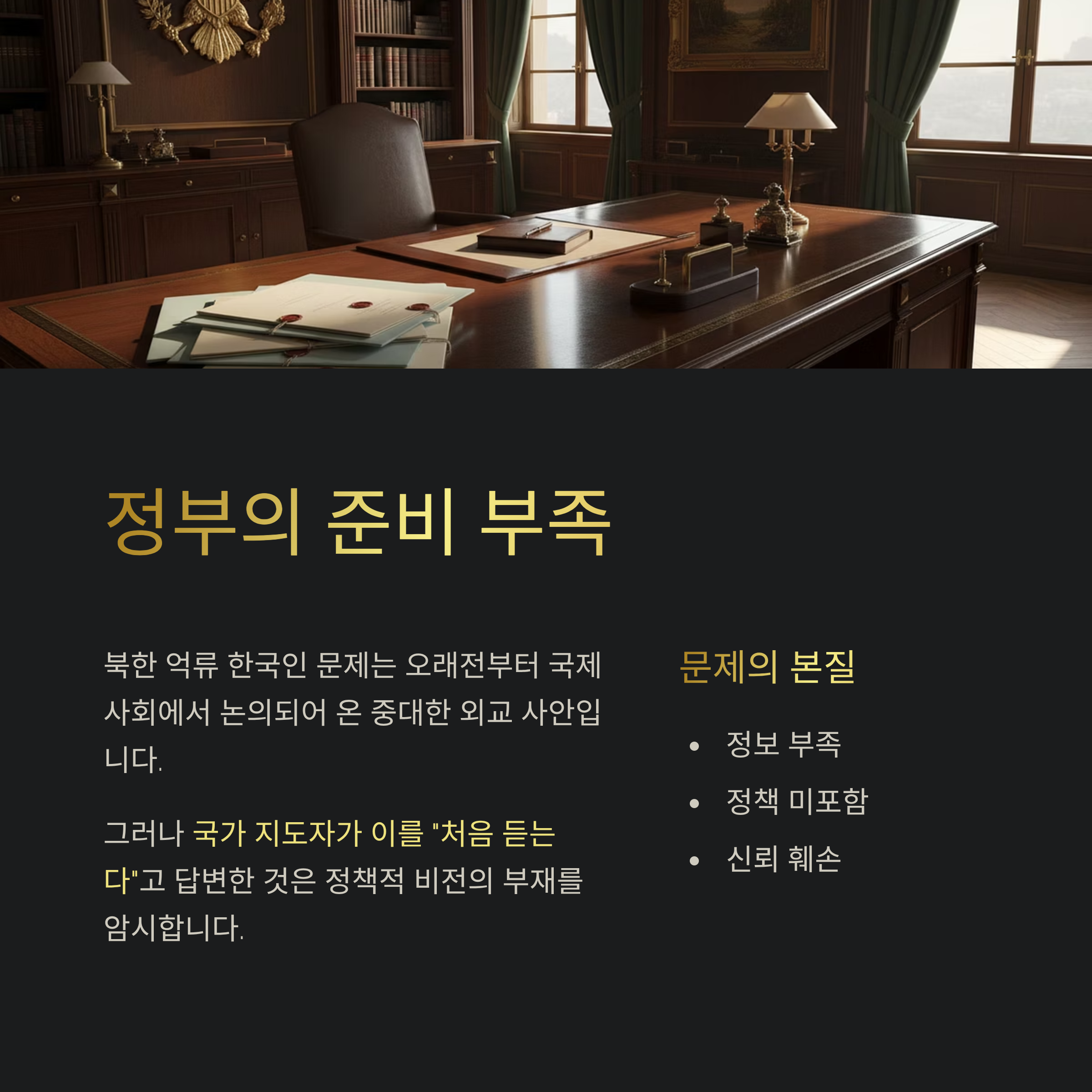 이재명 대통령 기자회견에서 발생한 이번 논란은 북한 인권 문제와 같은 중대한 외교적 사안에 대해 한국 정부가 얼마나 준비가 되어 있는지를 방증하는 사건으로 볼 수 있다. 북한 억류된 한국인 문제는 오래전부터 해결되지 않은 채 국제 사회에서 지속적으로 논의되어 왔다. 그러나 이재명 대통령은 해당 질문을 "처음 듣는다"는 반응을 보였으며, 이는 정치적 리더의 역할과 책임에 대한 기본적인 신뢰를 훼손할 수 있는 요소로 작용했다. 문제는 단순히 정보 부족이 아니라, 해당 질문이 이재명 정부의 정책적 비전에 어떠한 방식으로도 포함되지 않았음을 암시한다는 데 있다. 질문의 날카로움은 NK뉴스 기자의 전문성과 이 문제의 국제적 중요성을 기반으로 한다. 억압적인 북한 정권의 위험성을 알리며 동시에 억류된 자국민에 대한 보호 노력이 미흡한 현실을 비판하는 의도였다. 하지만 한국 정부는 이미 여러 정권을 거치며 이 문제를 해결하지 못했고, 이번 사건은 그 신뢰 부족이 여전히 소비자나 국민들에게 깊이 스며들어 있음을 보여주는 사례다.