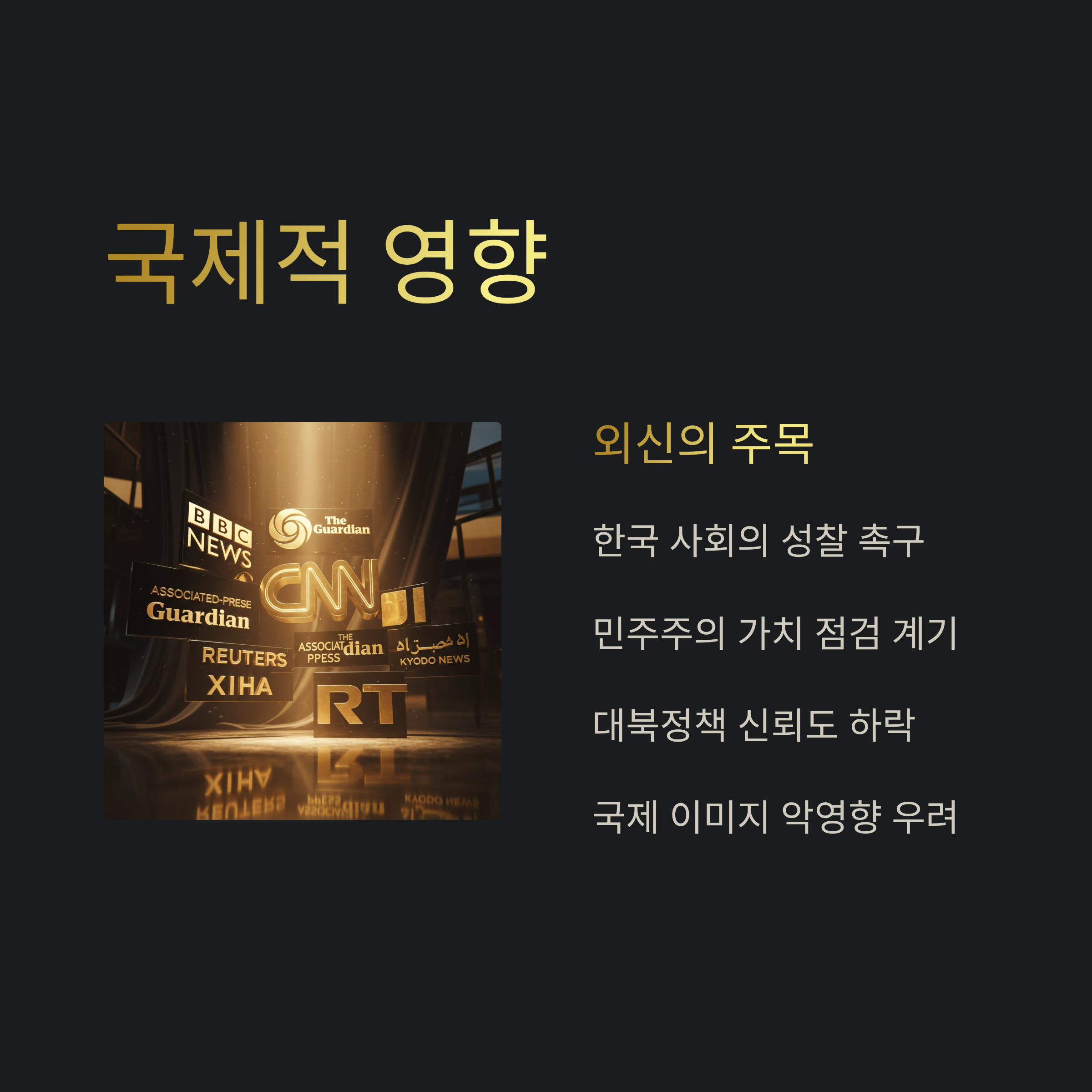 외신 기자의 질문은 단순한 비판을 넘어 한국 민주주의의 본질적인 가치를 점검하는 계기가 되었다. 그러나 기자는 이 문제를 제기한 뒤 정치적, 사회적 공세를 받으며 신변 위협까지 경험하게 되었다고 밝혔다. 이는 언론의 자유를 보장해야 하는 민주주의의 기본 가치를 위협하는 사례로 비춰질 수 있다. 현 정권뿐만 아니라, 과거 정부들 역시 이를 해결하지 못했지만, 비판의 초점은 현재의 지도자와 그의 대응력에 맞춰졌다. 더불어 언론이 감시자의 역할을 충실히 하기 위해 독립성과 안전을 보장받아야 한다는 점에서 이번 사건은 앞으로의 언론 자유 논의에도 중요한 교훈을 제공하고 있다. 외신들 또한 이와 관련된 한국 사회의 성찰을 촉구하고 있으며, 외국 언론 사이에서도 이번 사건은 상당한 주목을 받고 있다.