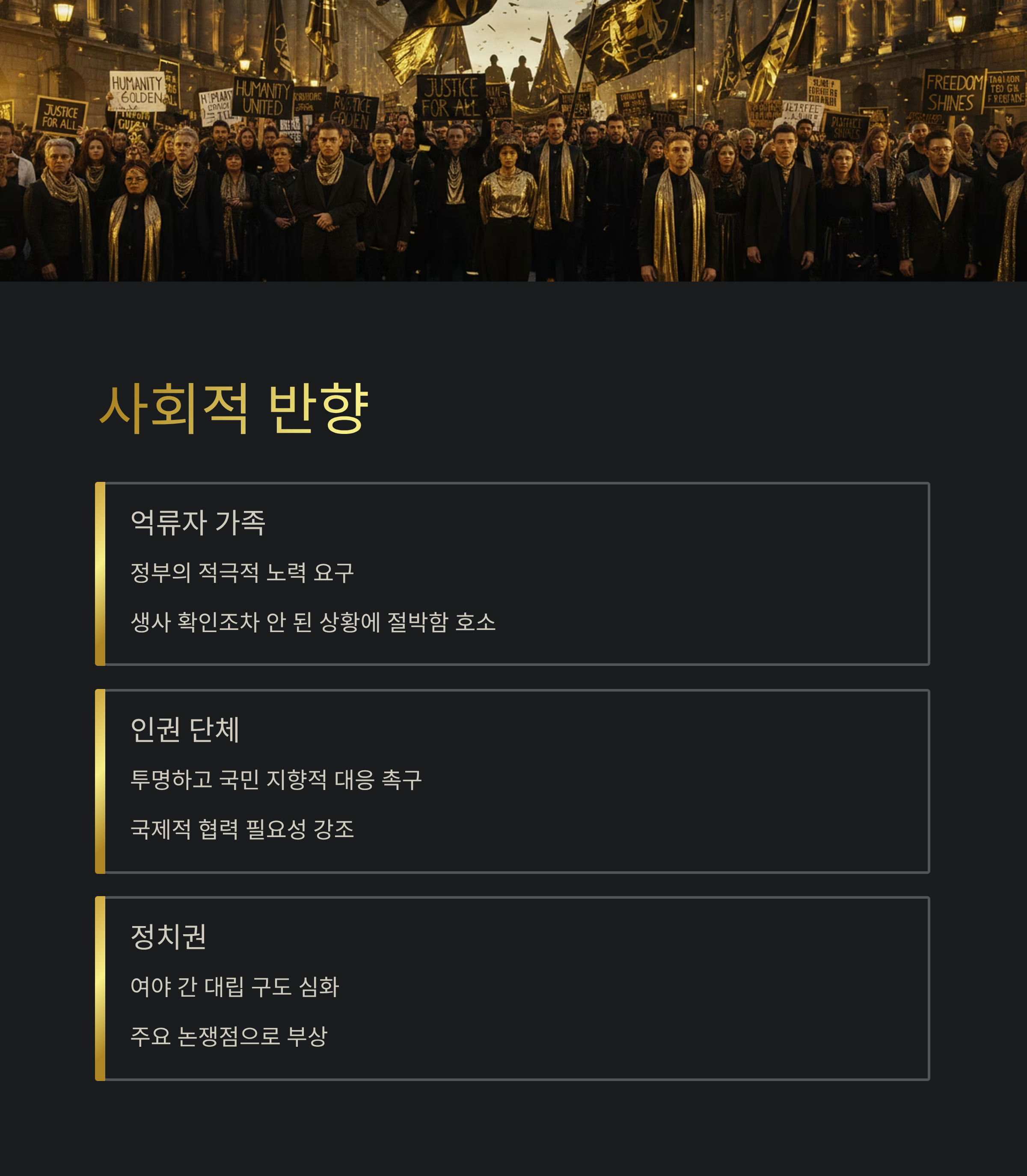 북한 억류자 가족들과 국내 여러 인권 단체들은 정부에 더욱 적극적인 노력을 요구하고 있다. 억류된 개인의 생사 여부조차 확인되지 않은 상황은 시간을 지체할수록 악화되는 속성을 지닌다. 이에 대한 대답이 없거나 준비되지 않은 태도는 국제적 비판뿐만 아니라, 국내에서도 큰 실망을 불러일으킨다. 정부의 대응 방식은 좀 더 투명하고 국민 지향적이어야 한다. 불안정한 반응과 미진한 준비 상태는 한국 사회의 대북정책과 국제적 이미지에도 악영향을 미칠 수 있다. 이 모든 상황은 정치적으로 분열된 상황에서 주요 논쟁점으로 부상하며, 여야 간 대립 구도를 심화시키는 요인이 되고 있다.