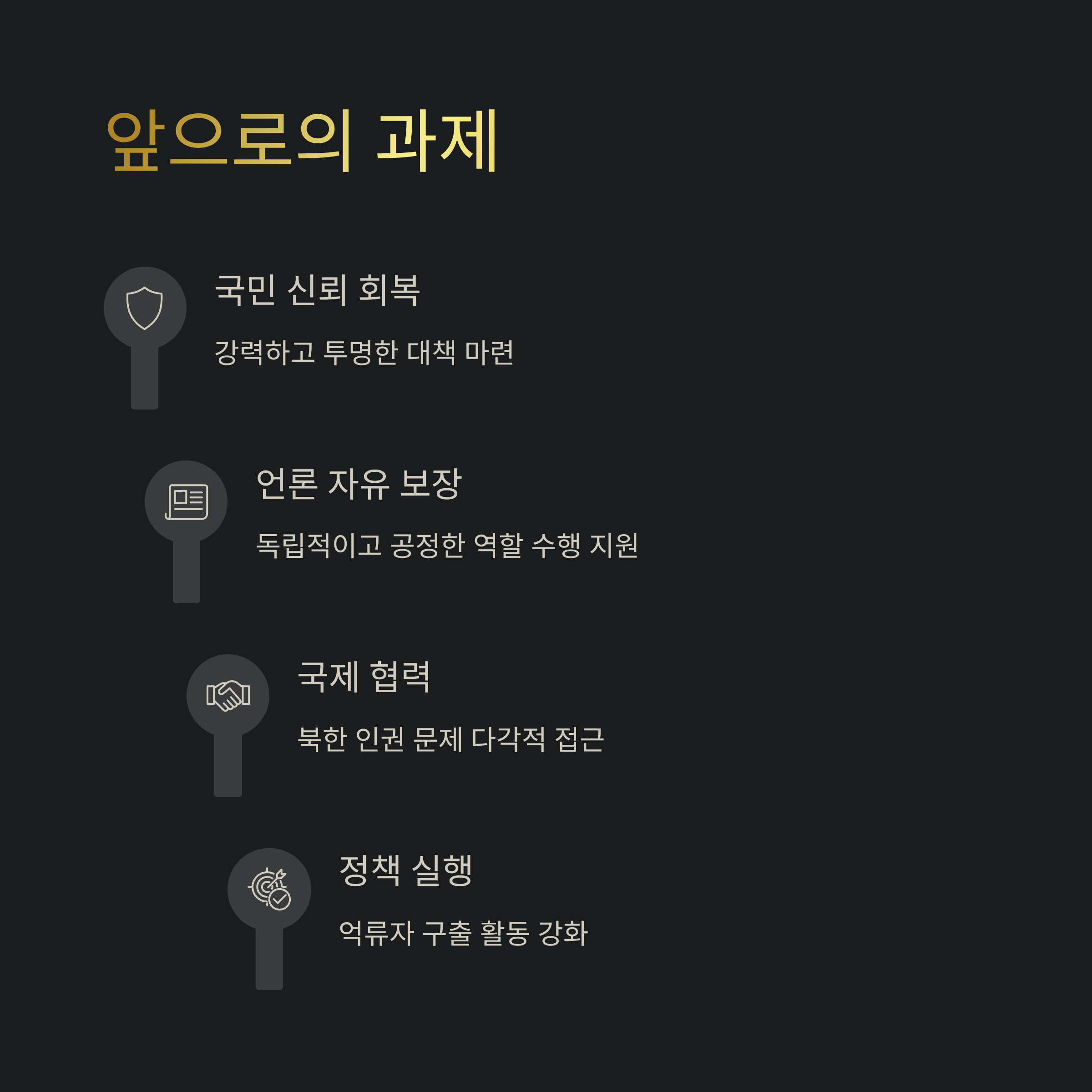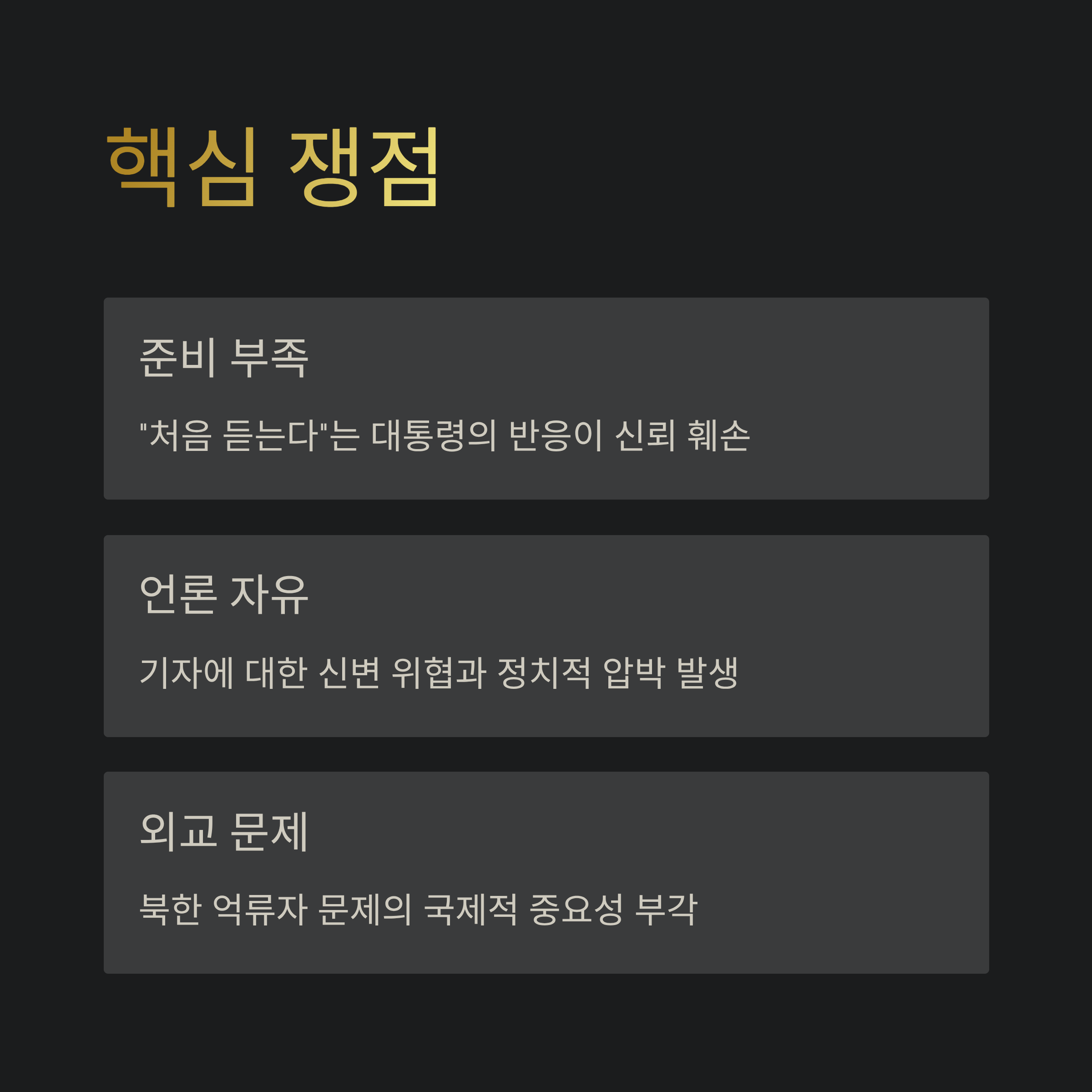 이재명 대통령과 외신 기자 간의 이번 논란은 단순히 개인의 준비성 부족 문제를 넘어 한국 정부와 언론의 구조적 결함을 드러낸 사건이다. 북한 인권 문제는 다각적 접근과 국제적 협력을 필요로 하며, 억류된 한국인의 구출 활동은 단순히 인도적 측면에서 중요한 것이 아니라, 국가적 자존심과 책임의 문제이기도 하다. 민감한 외교 사안에 대한 정부의 태도와 언론 자유를 어떻게 관리하느냐는 한국 민주주의의 진보와 성숙을 가늠할 중요한 잣대가 된다. 앞으로의 정치적 리더십은 단순한 비판을 넘어 실질적 대응력을 요구받고 있으며, 언론은 더욱 공정하고 독립적으로 역할을 수행해야 할 것이다. 이러한 복합적 문제가 표면화된 이번 사건은 한국 사회의 정치적, 사회적 구조를 다시 점검하는 계기를 제공한다. 국민의 신뢰 회복을 위해서는 더욱 강력하고도 투명한 대책 마련이 시급하다.