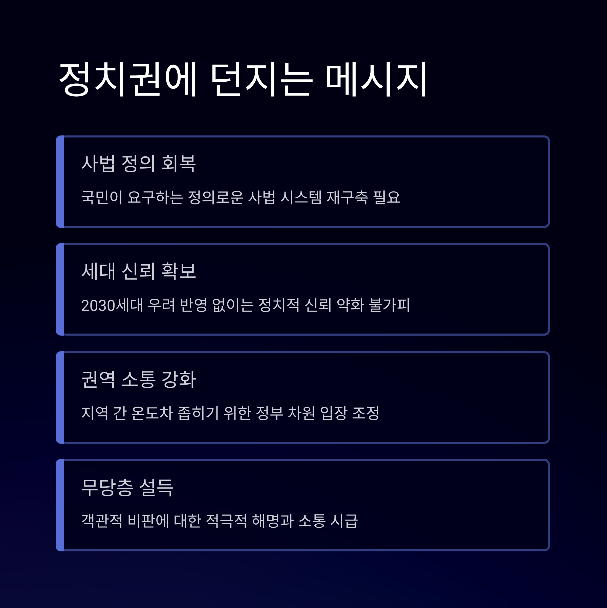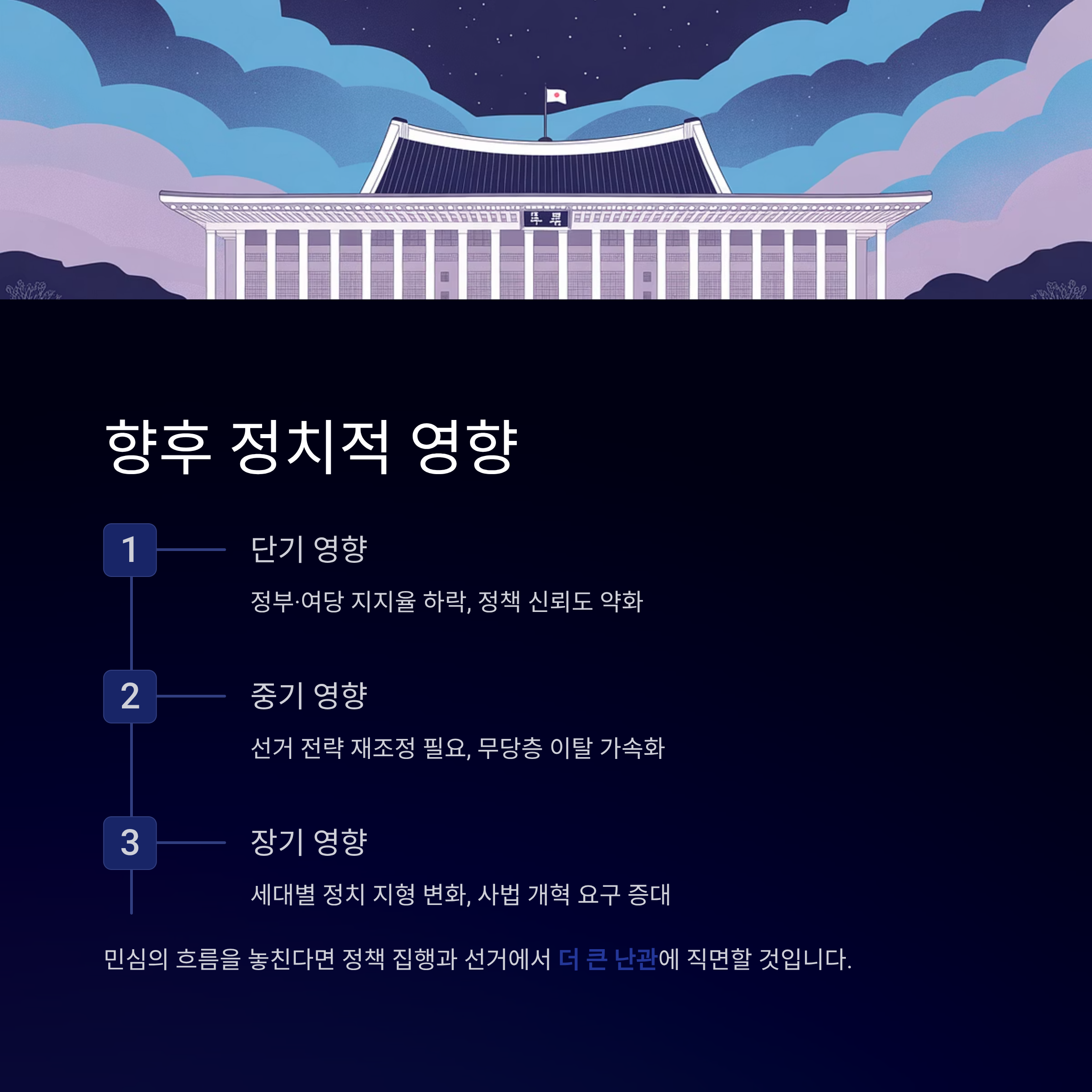 궁극적으로 이번 사건은 국민이 원하고 기대하는 '정의로운 사법 시스템'의 재구축 방향을 시사합니다. 이러한 민심의 흐름을 놓친다면 정부와 여당은 향후 정책 집행과 선거에서 더욱 큰 난관에 직면할 가능성이 큽니다.