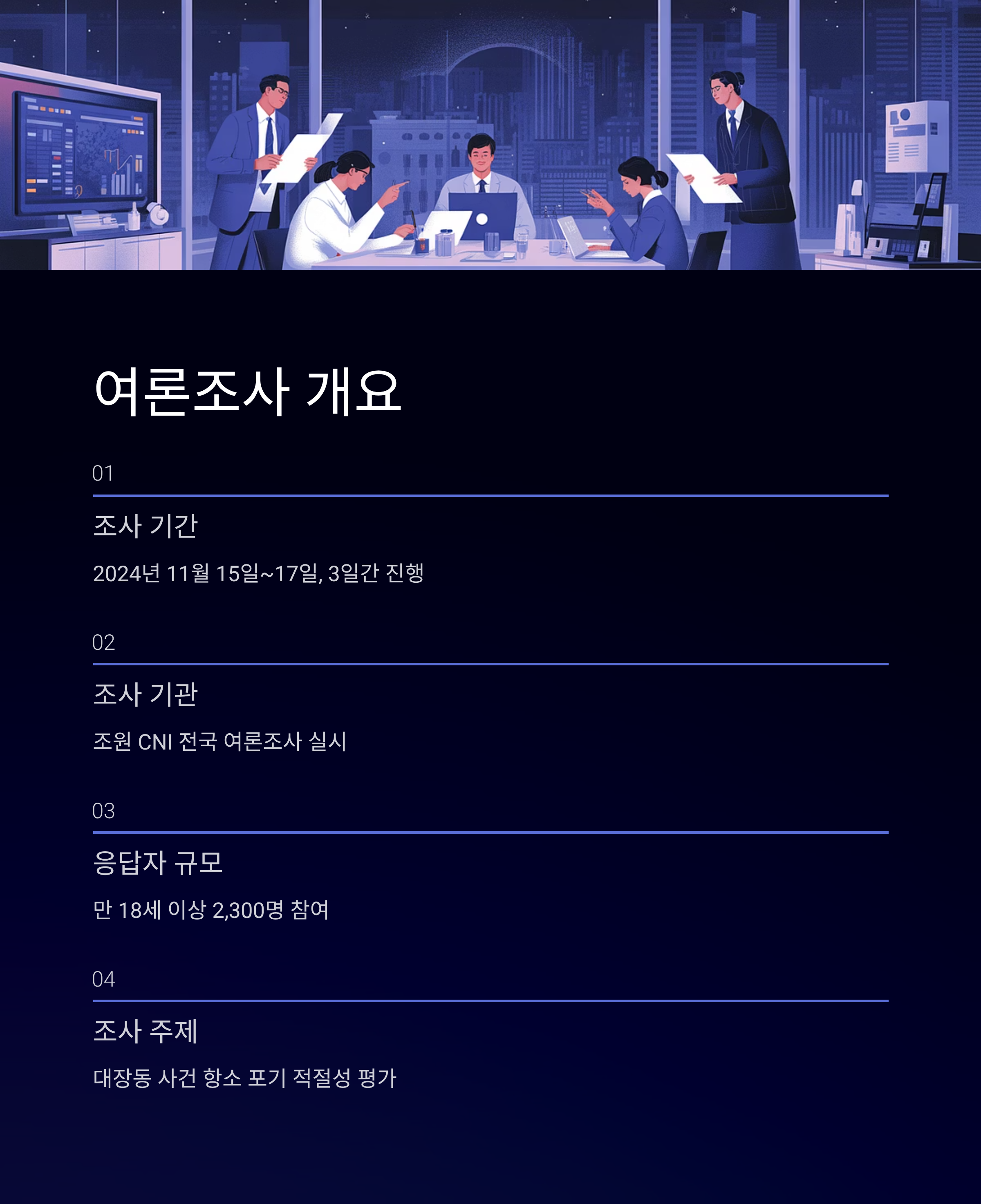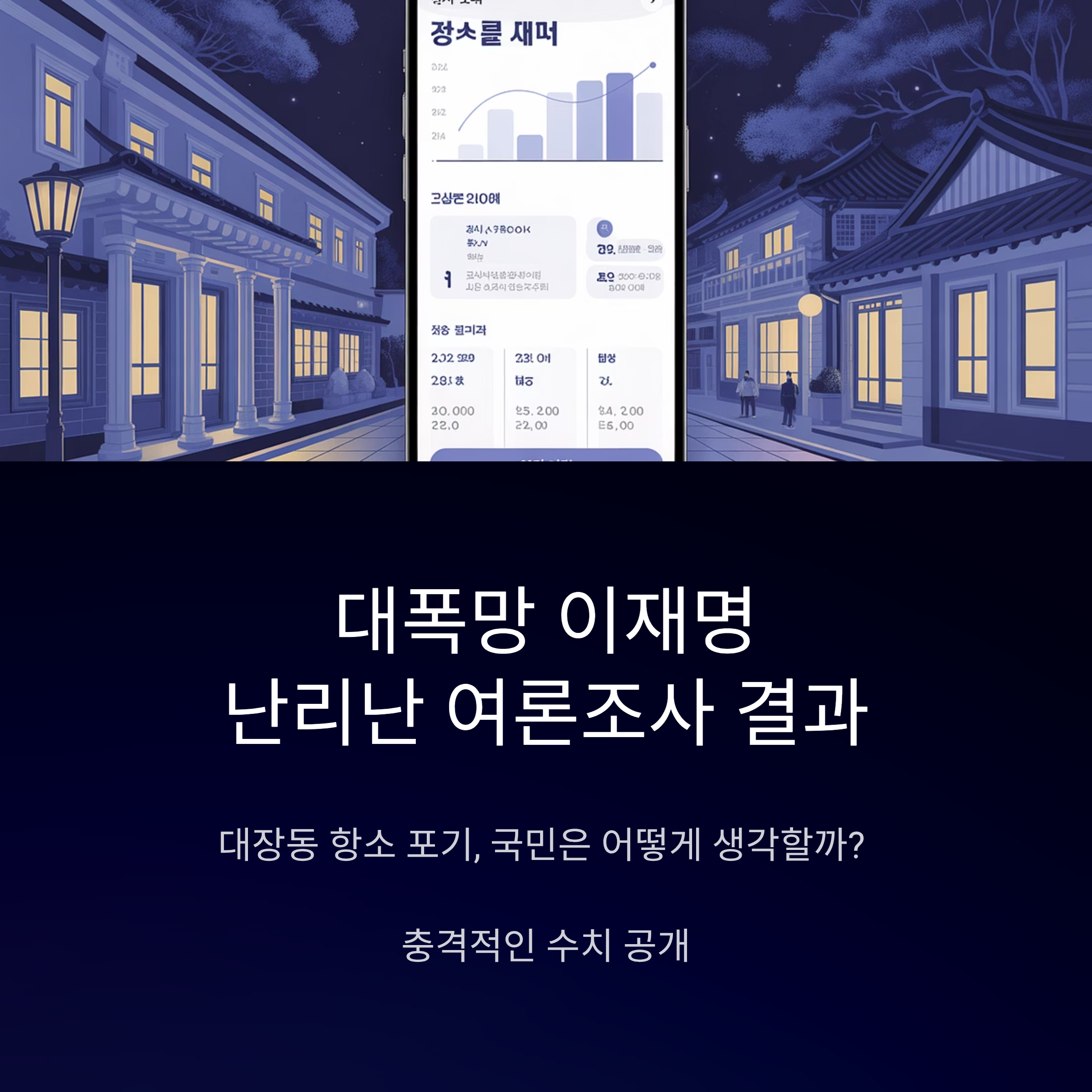 최근 발표된 대장동 관련 여론조사가 정치권에 큰 파문을 일으키고 있습니다. 이는 11월 15일부터 17일까지 조원 CNI가 실시한 전국 여론조사로, 만 18세 이상 2,300명의 응답 데이터를 바탕으로 대장동 사건과 관련된 국민의 의견을 분석한 결과입니다. 특히 이번 조사에서 나온 '항소 포기'와 관련된 의견은 정부와 여당에 대한 국민 신뢰도에 큰 영향을 미쳤습니다.