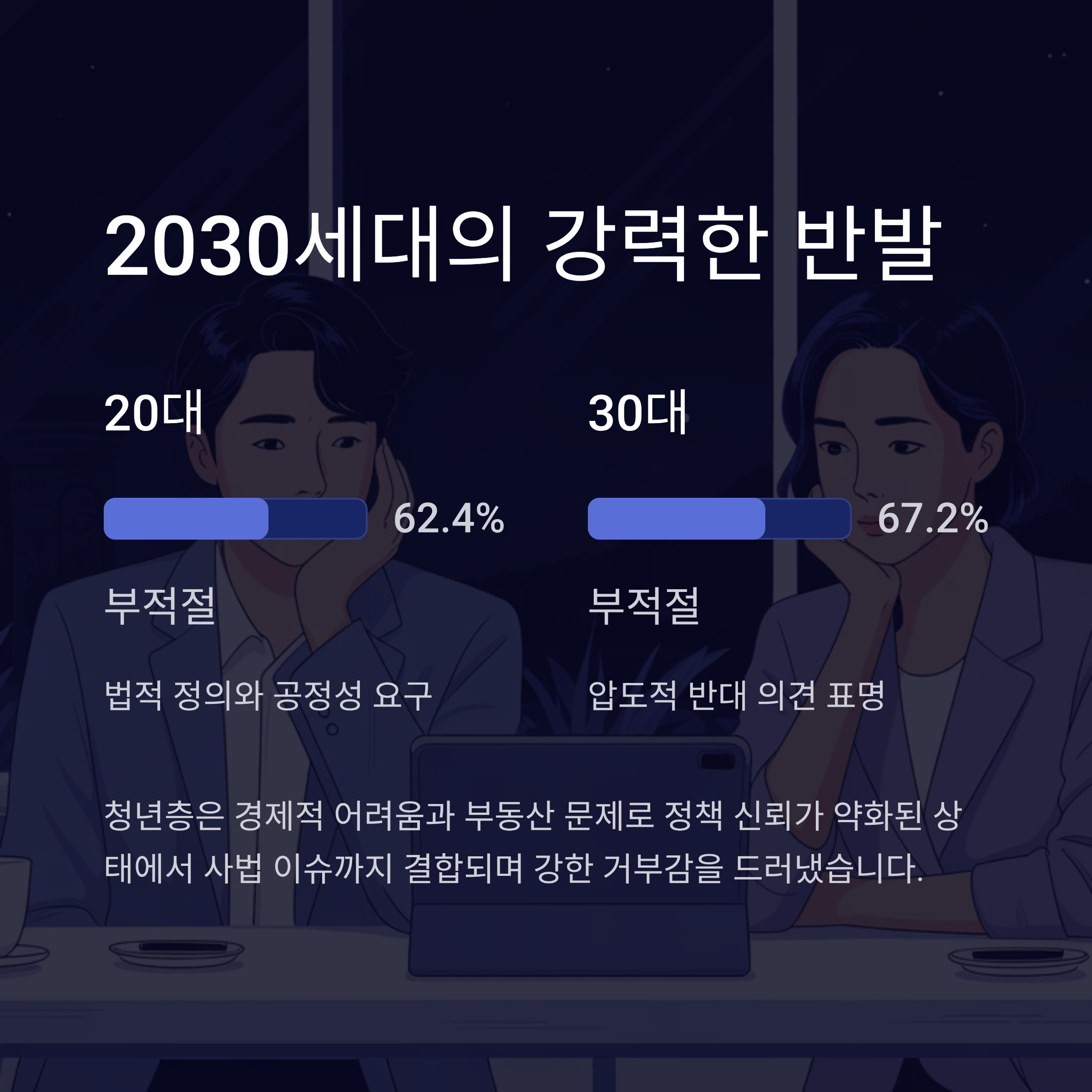 - 연령대별로 20대(62.4%)와 30대(67.2%)에서 압도적으로 부적절 의견이 우세했습니다.