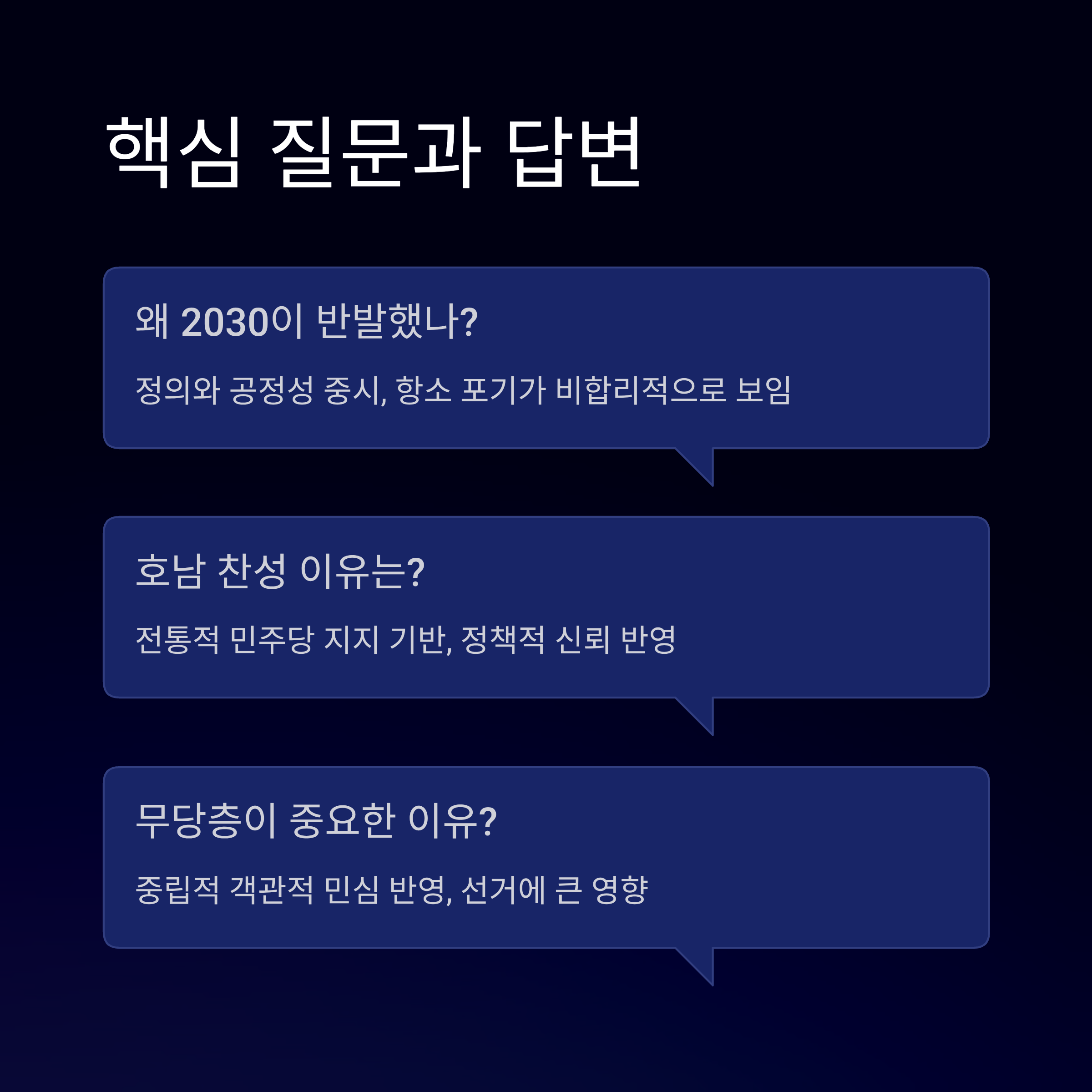 조사에 따르면 지역·연령·성별에 따라 의견이 다양하게 갈리는 양상을 보였습니다. 권역별로 분석했을 때, 민주당의 지지 기반인 호남 외 지역에서는 대체로 정부의 결정에 비판적인 의견이 우세했습니다. 추가적인 여론 분석을 통해 청년층의 강한 반대와 무당층의 냉소적 반응 역시 정치적 논의에서 검토가 필요한 중요한 포인트로 부각되었습니다. 이번 글에서는 여론 데이터의 함의를 명확히 분석하며 정치권이 받아들여야 할 국민적 메시지를 정리하겠습니다.