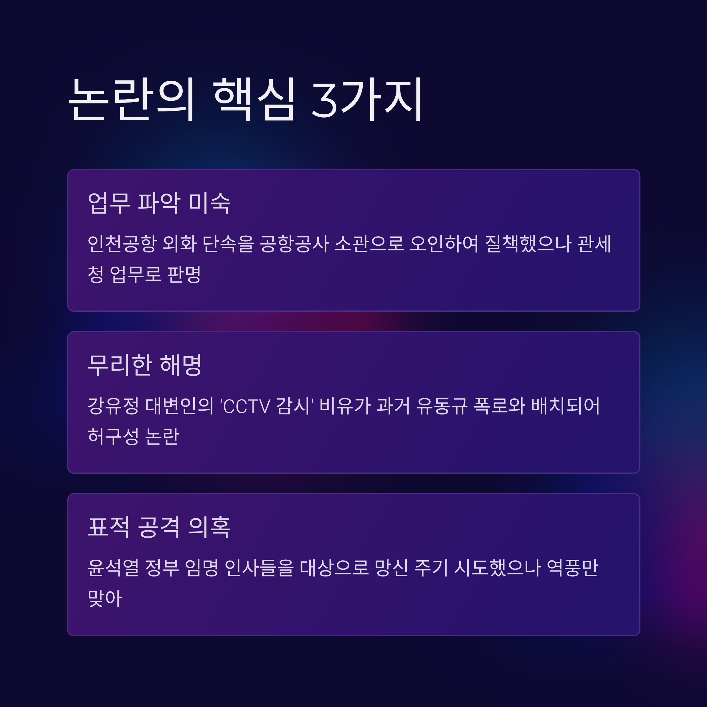 무리한 해명과 모순: 강유정이 한 말, 즉 생중계를 'CCTV 감시'에 비유한 해명은 과거 유동규 씨의 폭로와 배치되어 허구성 논란을 자초했습니다. 이는 대통령의 실수를 덮기 위한 억지 해명이라는 비판을 받습니다.
