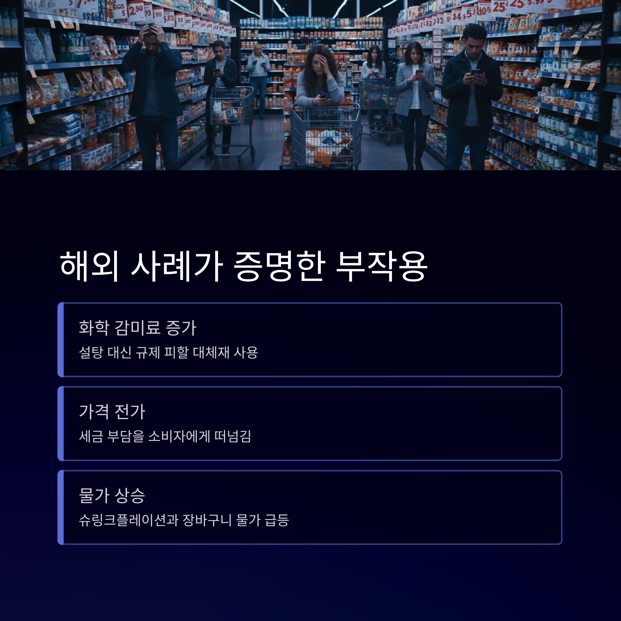 | A. 가장 큰 이유는 물가 상승, 즉 '인플레이션'에 대한 우려입니다. 기업들이 세금 부담을 제품 가격에 반영하여 소비자에게 전가하거나, 설탕 대신 다른 화학 감미료를 사용하여 오히려 건강에 해를 끼칠 수 있다는 부작용이 다른 나라의 사례를 통해 이미 확인되었기 때문입니다. |