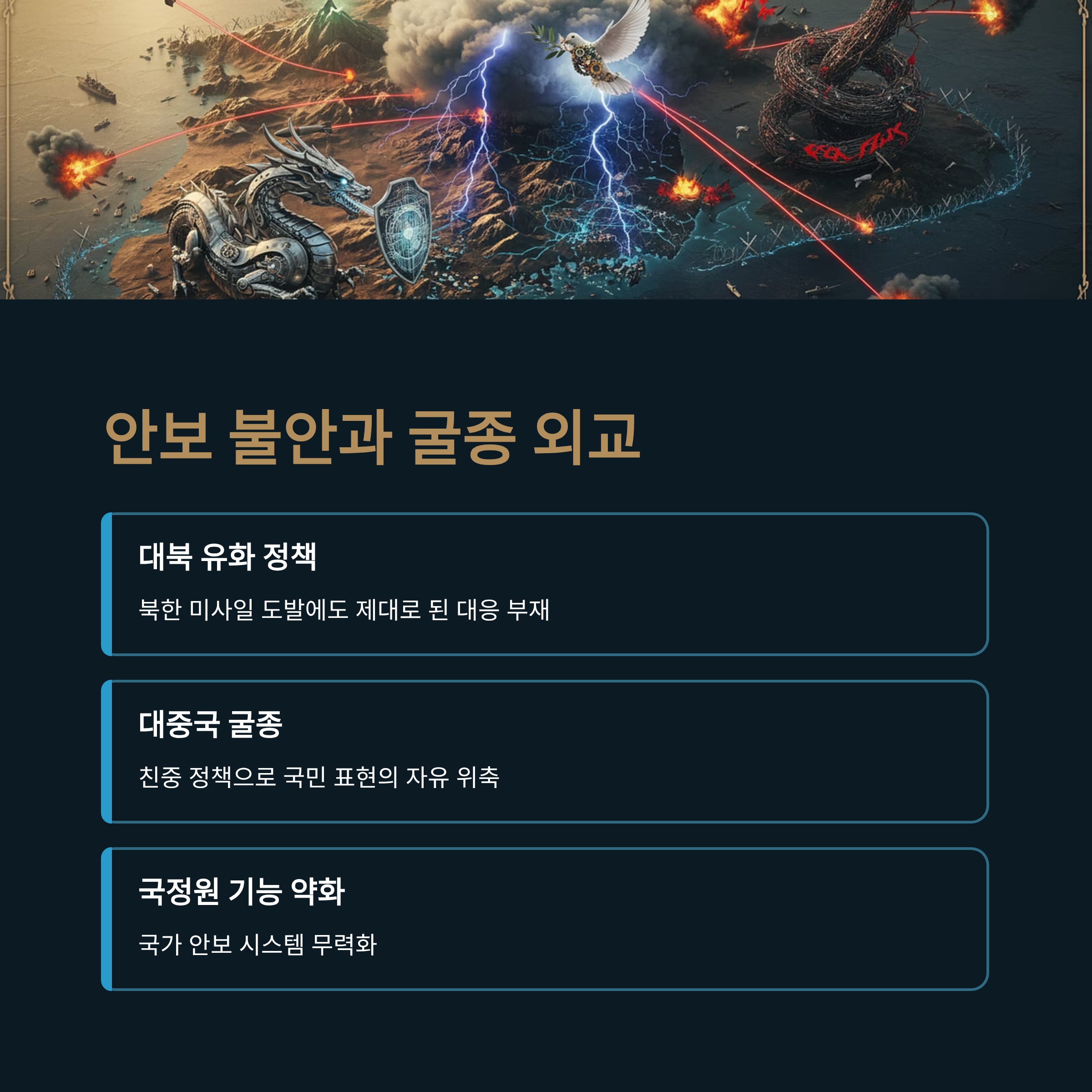 경제뿐만 아니라 국가 안보와 사법 시스템의 붕괴 또한 심각한 수준입니다. 현 정부 들어 대북 유화 정책 기조 속에 북한의 미사일 도발에도 제대로 된 대응을 하지 못하고 있으며, 대중국 관계에 있어서도 굴종적인 태도를 보인다는 비판이 제기됩니다. "중국을 욕하면 처벌받는다"는 식의 표현은 과장일 수 있으나, 그만큼 국민들이 느끼는 표현의 자유 위축과 친중 정책에 대한 반감이 극에 달했음을 시사합니다.