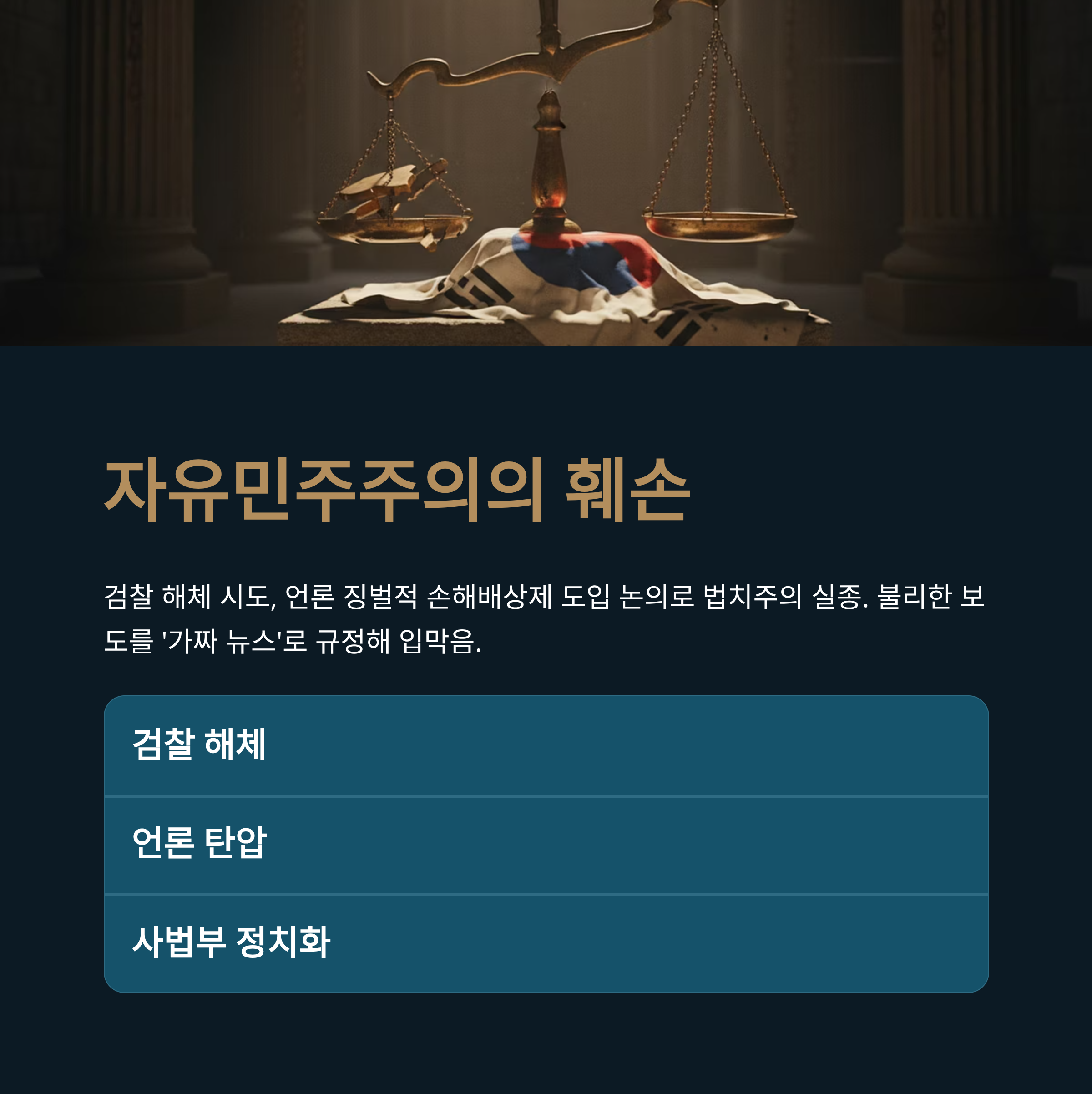 더욱이 검찰 해체 시도와 국정원 기능 약화, 그리고 언론에 대한 징벌적 손해배상제 도입 논의는 자유민주주의의 근간을 흔들고 있습니다. 자신들에게 불리한 보도를 '가짜 뉴스'로 규정하여 입을 막으려 하고, 사법부를 정치화하여 특정 진영의 이익을 보호하려는 시도는 법치주의의 실종을 의미합니다. 전두환 전 대통령을 독재자라 비판하던 세력이 집권하여 오히려 더 교묘한 방식으로 국민의 자유를 억압하고 있다는 역설적인 평가가 나오는 이유입니다.