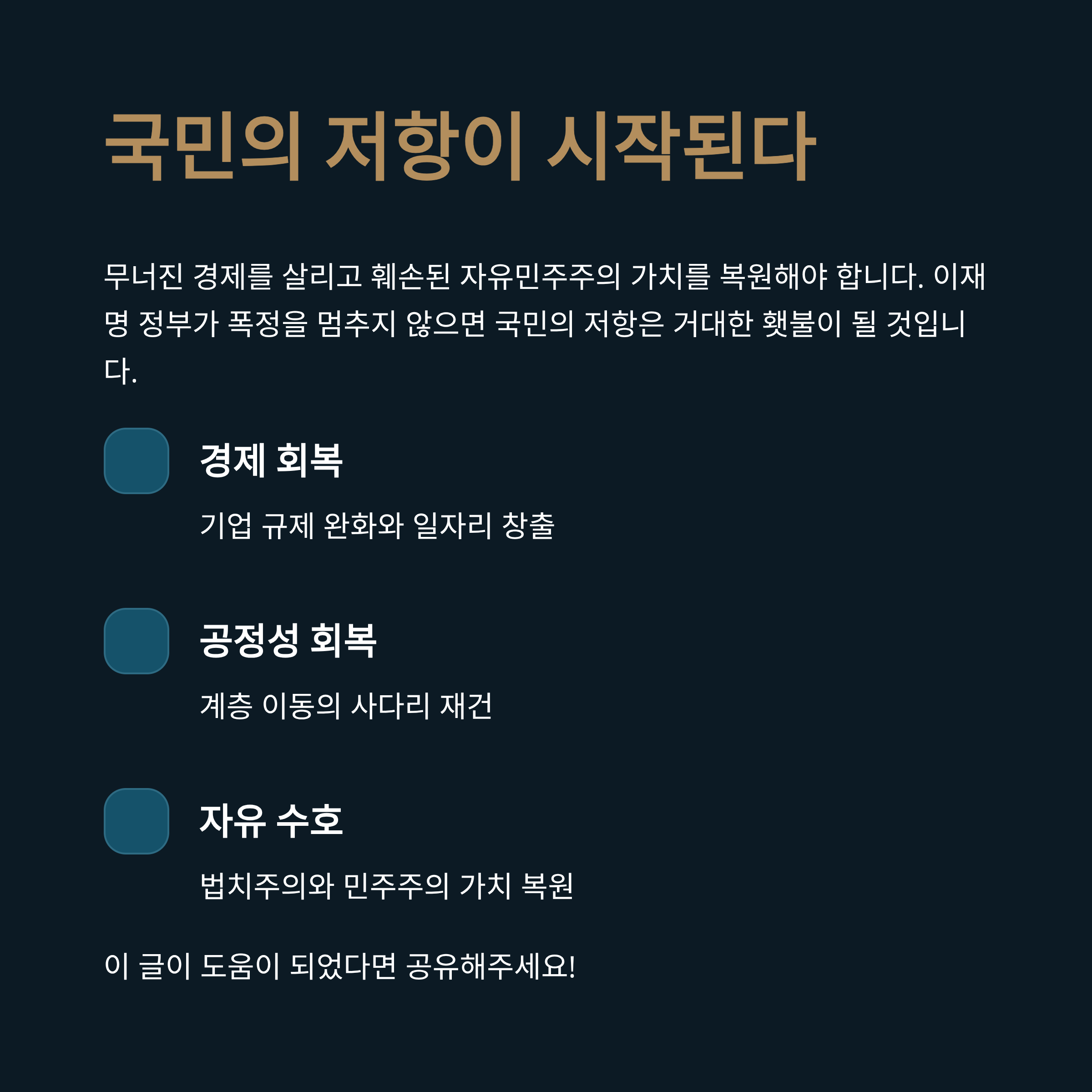 요약하자면 현재의 위기는 잘못된 탄핵 결정과 이재명 정부의 실정이 결합된 결과이며, 국민들은 과거의 권위주의 시대보다 못한 현재의 삶에 절망하고 있습니다.