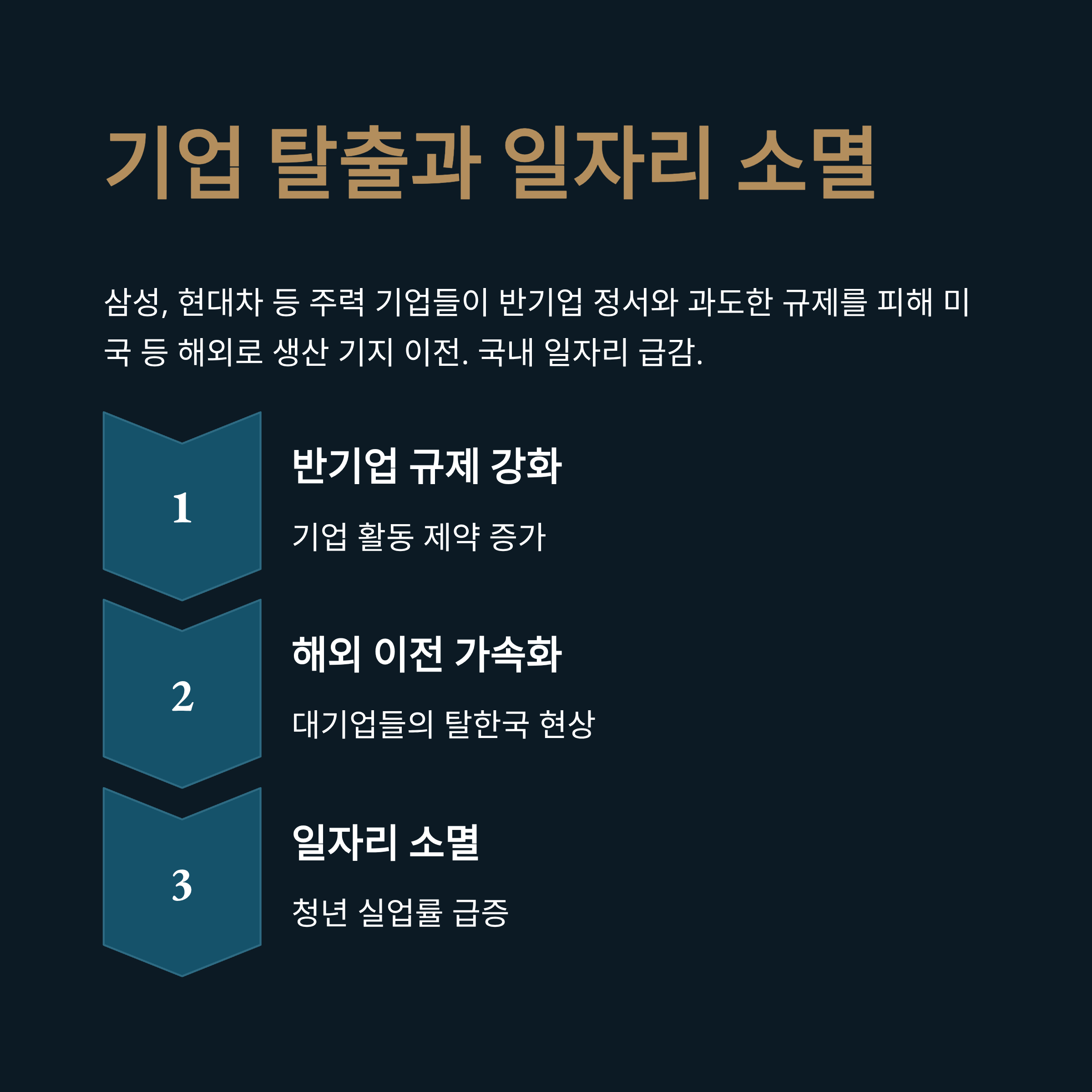 | A3. 기업 규제와 반기업 정서로 인해 삼성 등 대기업들이 미국 등 해외로 탈출하고 있어 국내 일자리가 사라지고 있다고 지적합니다. 또한 새벽 배송 규제 등으로 소비자 불편을 초래하고, 과도한 부동산 규제나 건설 현장 중단 등으로 집값 상승을 부추기고 있다는 비판이 제기됩니다. |