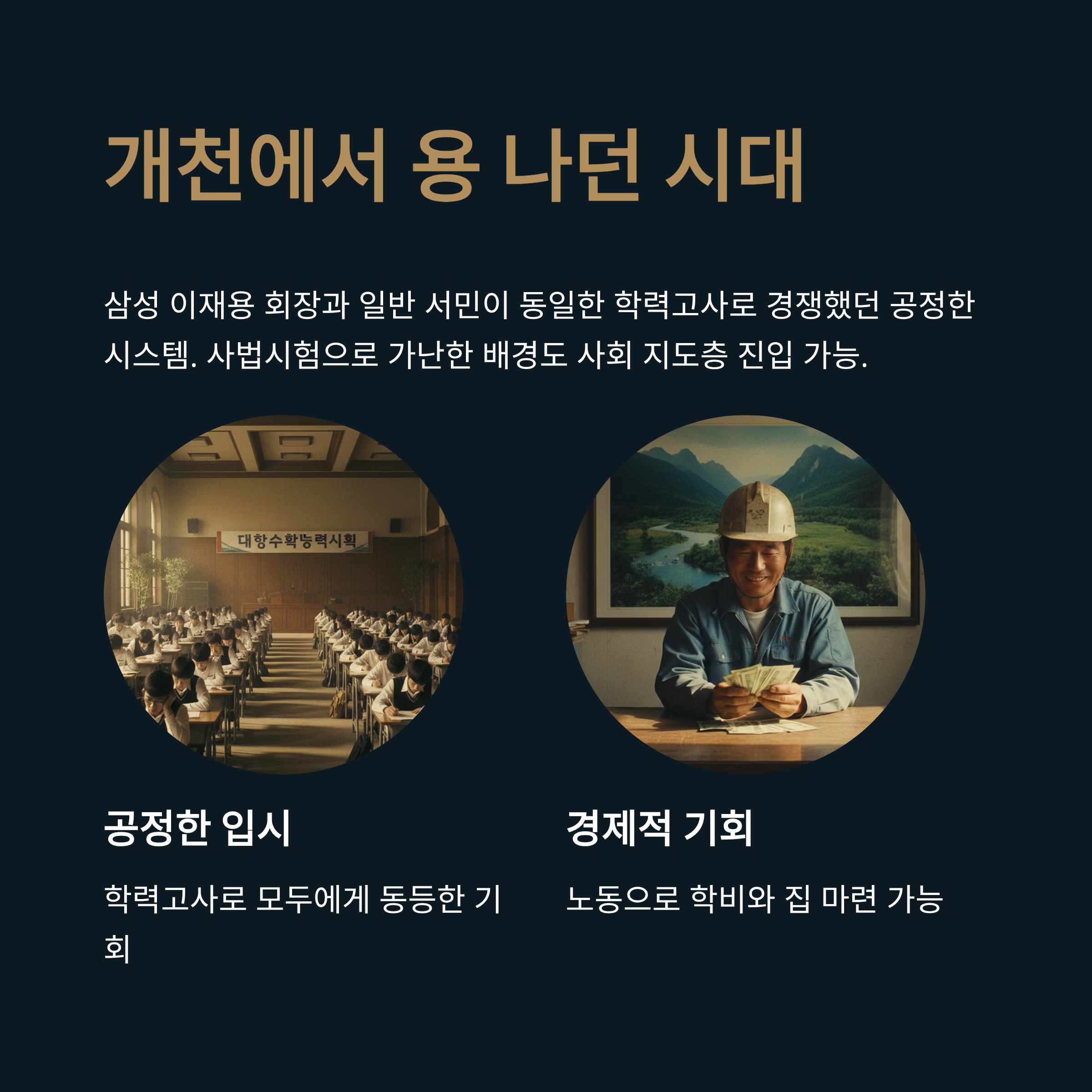 전두환 시대가 재평가받는 핵심 이유는 '계층 이동의 가능성'과 '결과의 공정성'에 있습니다. 당시에는 일용직 노동을 통해서도 학비를 벌 수 있었고, 사법시험을 통해 가난한 배경을 가진 사람도 사회 지도층으로 진입할 수 있는 '개천에서 용 나는' 구조가 작동했습니다. 삼성 이재용 회장과 일반 서민이 동일한 학력고사 시스템 하에서 경쟁했던 점은 당시의 교육적 공정성을 상징합니다.
