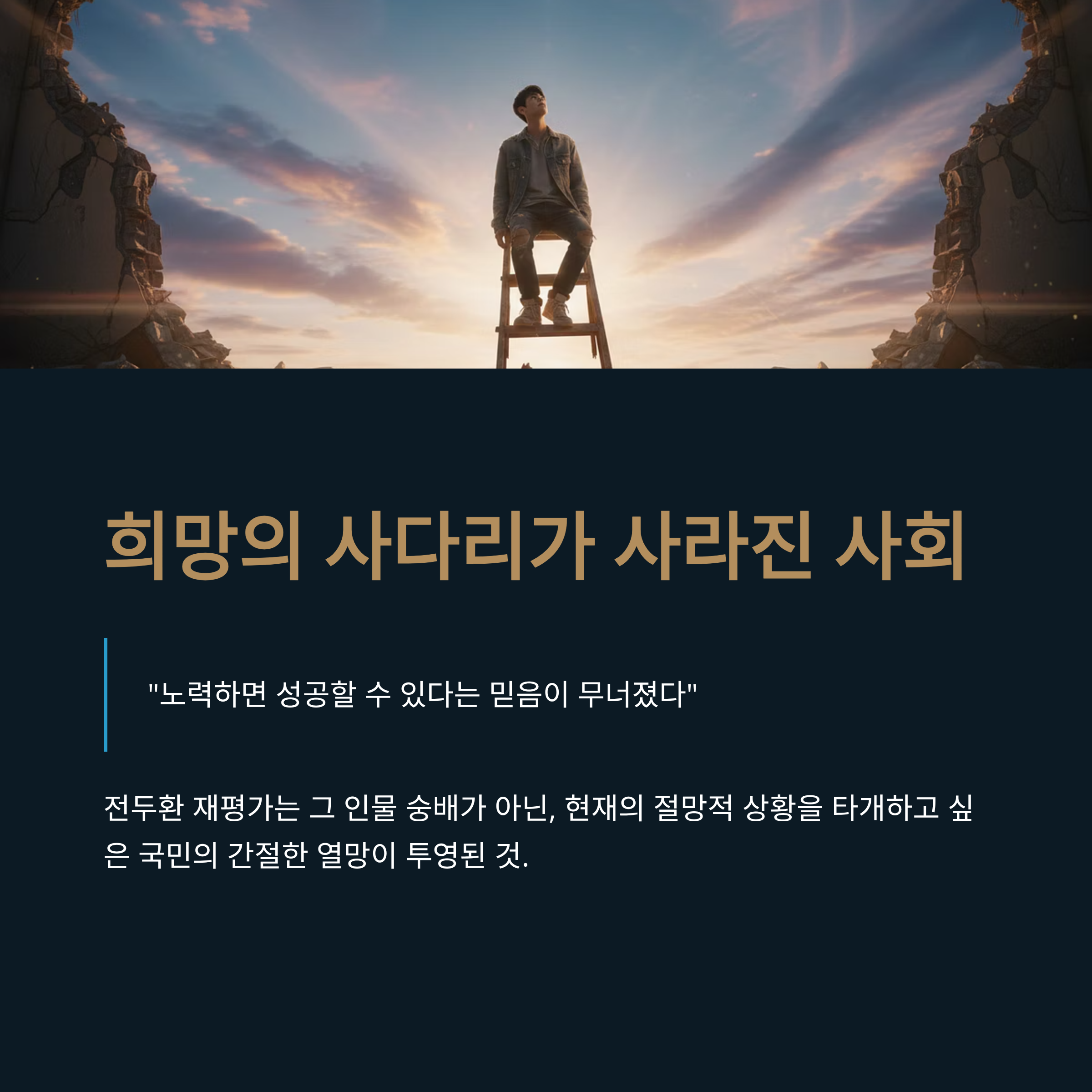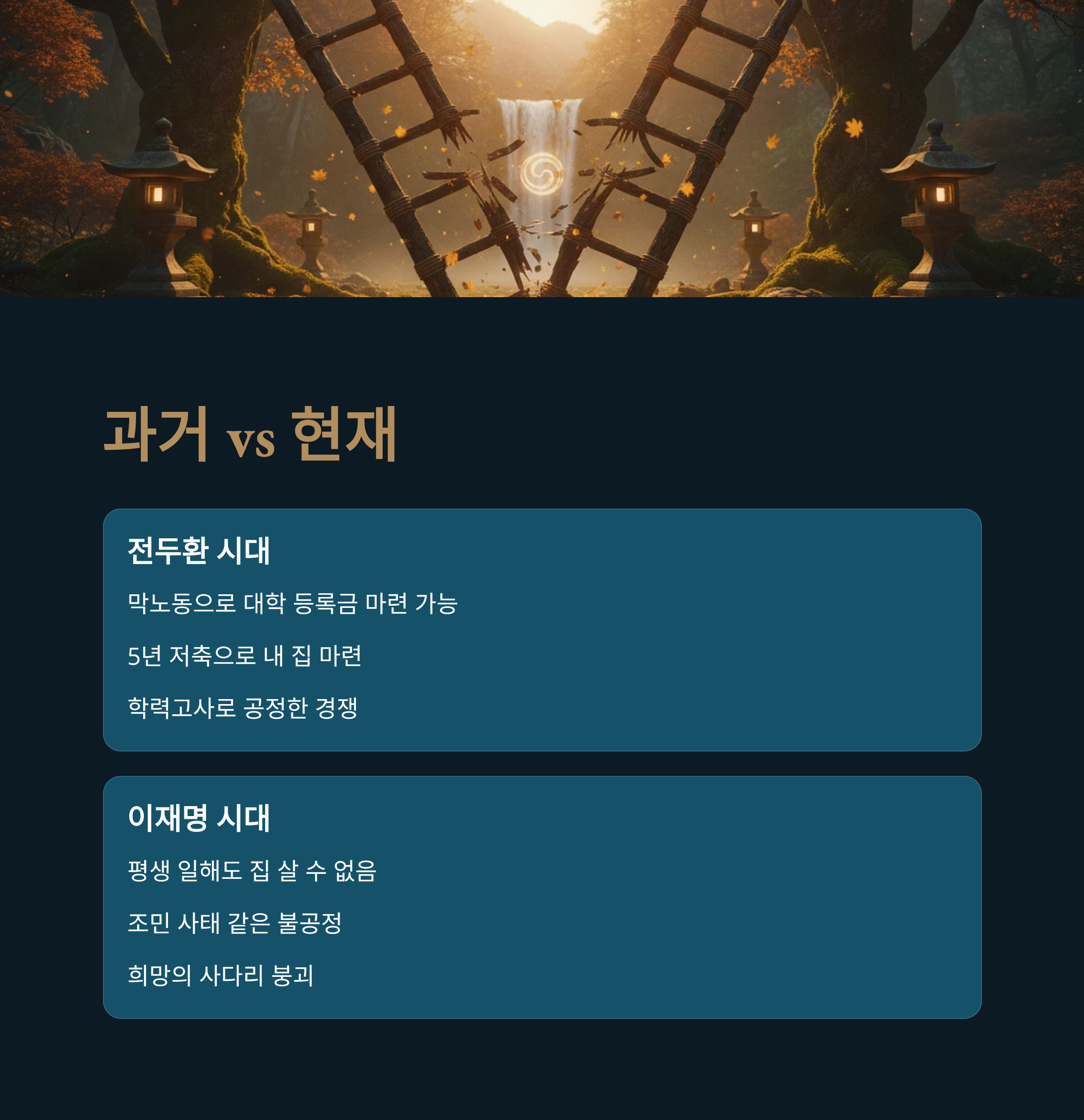 반면 이재명 시대의 대한민국은 이러한 사다리가 걷어차인 상태입니다. 조국 전 장관의 딸 조민 사례에서 보듯 부모의 지위와 편법이 성공을 좌우하는 사회가 되었으며, 청년들은 아무리 노력해도 서울에 아파트 한 채 마련하기 힘든 '생지옥'을 경험하고 있습니다. "가재, 붕어, 개구리로 살라"는 식의 위선적인 조언에 국민들이 분노하며, 차라리 경제적으로 풍요롭고 기회가 있었던 과거를 그리워하게 된 것입니다.