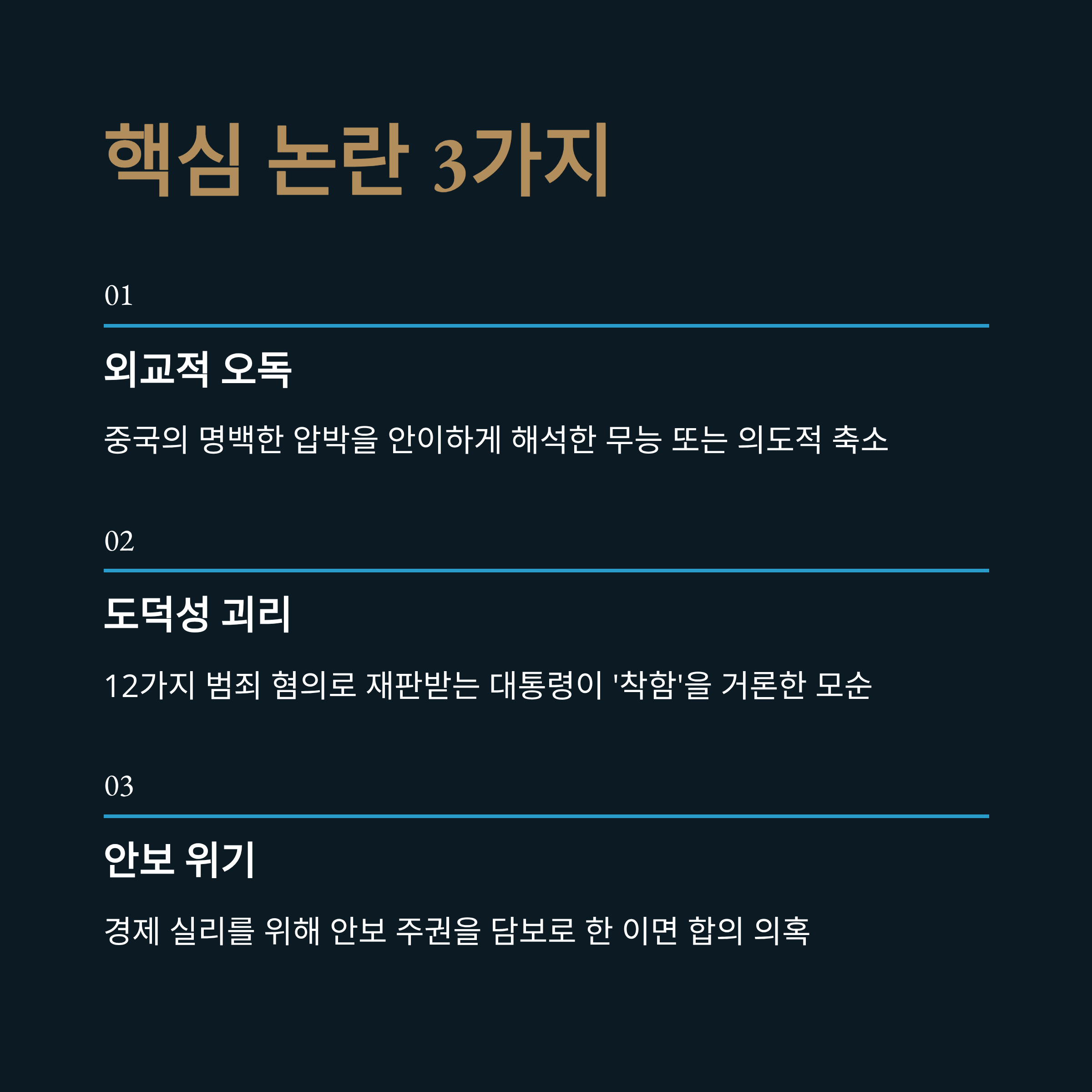 - 분석: 외교적 함의, 도덕성 괴리, 안보 리스크 등 3가지 측면 심층 분석
