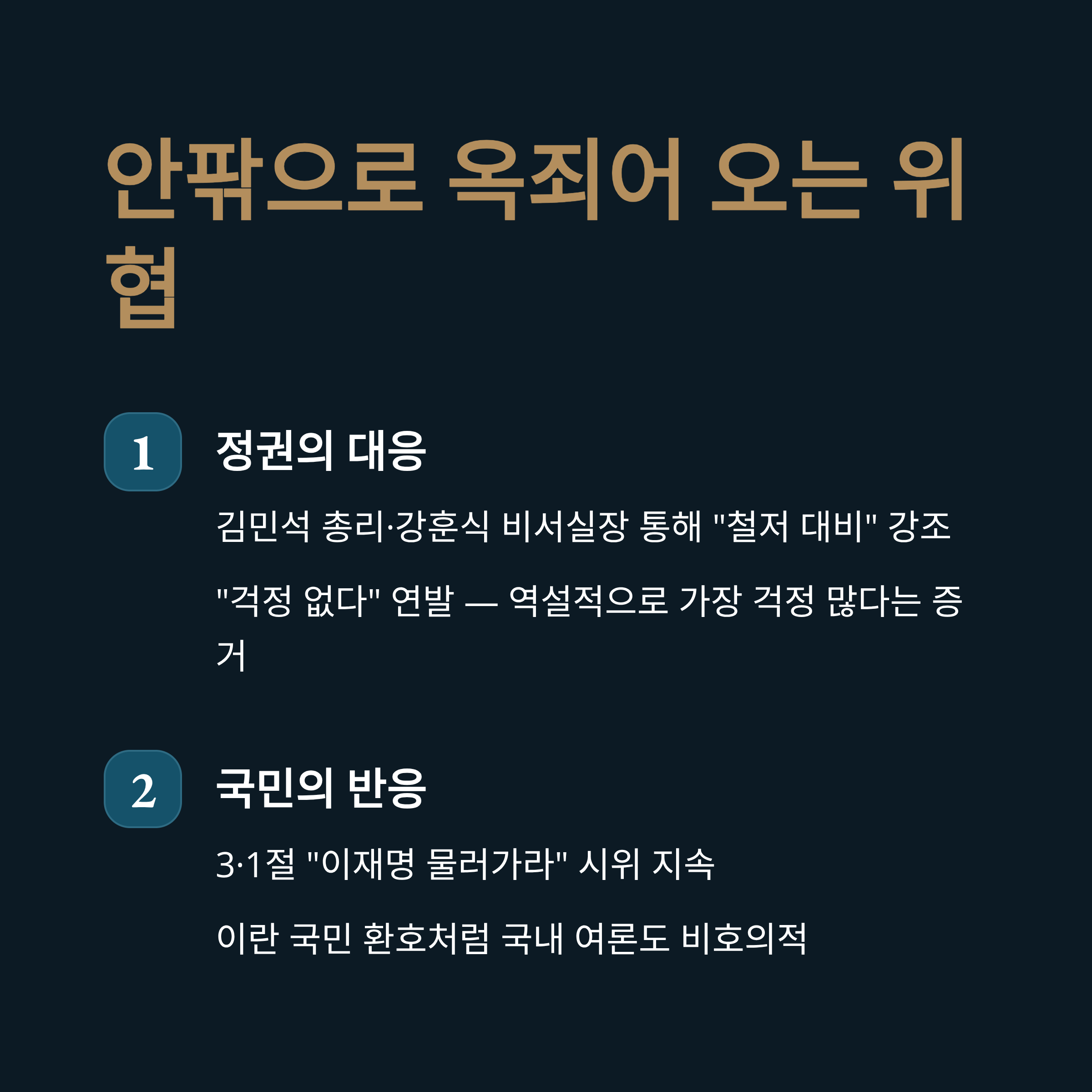 싱가포르 방문 중에도 이재명 대통령은 김민석 국무총리와 강훈식 비서실장을 통해 내각과 청와대가 철저히 대비하고 있음을 강조했습니다. "만약에 있을 수 있는 모든 가능성"에 대비한다는 말은 이란-이스라엘 전쟁에 따른 경제적 파장보다는, 정권의 안위와 관련된 급변 사태를 염두에 둔 것으로 보입니다. 중국조차 유엔 대사의 원론적 입장 외에 공식 논평을 자제하며 상황을 예의주시하는 가운데, 대한민국 정부만이 과도하게 "걱정 없다"를 연발하는 것은 역설적으로 가장 걱정이 많다는 증거입니다. 국내에서는 3·1절을 맞아 "이재명 물러가라"는 시위가 이어지고 있으며, 이란 국민들이 하메네이의 죽음에 환호하듯 국내 여론 또한 정권에 호의적이지 않다는 점을 대통령은 인지하고 있습니다. 이러한 내부의 적과 외부의 위협이 동시에 옥죄어 오는 상황이 대통령을 더욱 위축되게 만들고 있습니다.