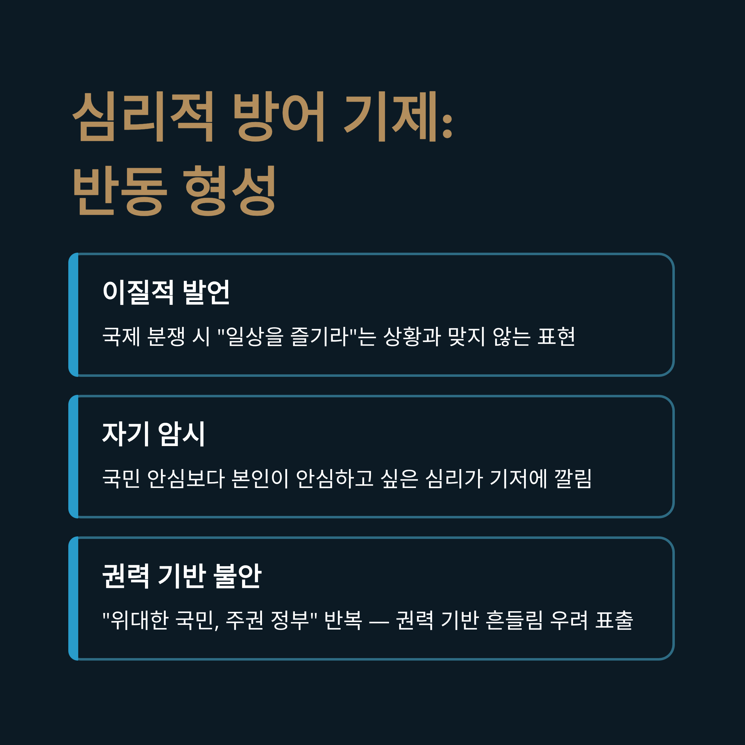 | A2. 통상적인 안보 당부와 달리 매우 이례적인 표현입니다. 이는 국민을 위한 메시지라기보다는, 대통령 본인이 느끼는 극심한 공포와 불안감을 감추고 스스로를 안심시키기 위한 심리적 방어 기제(반동 형성)가 투영된 것으로 해석됩니다. 즉, 국민보다 자신에게 하는 자기 암시에 가깝습니다. |