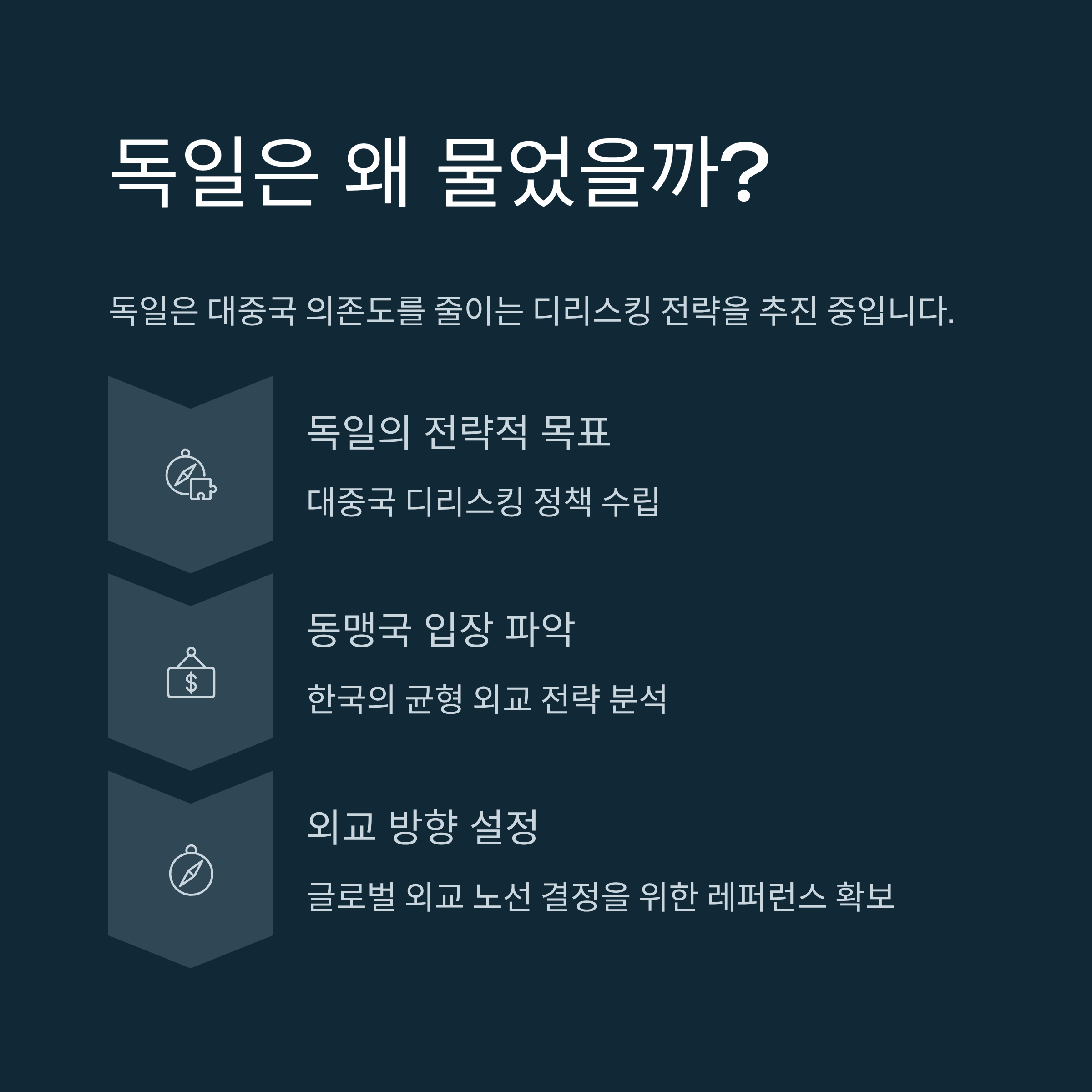 | A. 독일은 현재 자국의 디리스킹 전략을 수립하고 있어, 한국의 입장을 참고해 글로벌 외교 방향성을 설정하려 했습니다. |