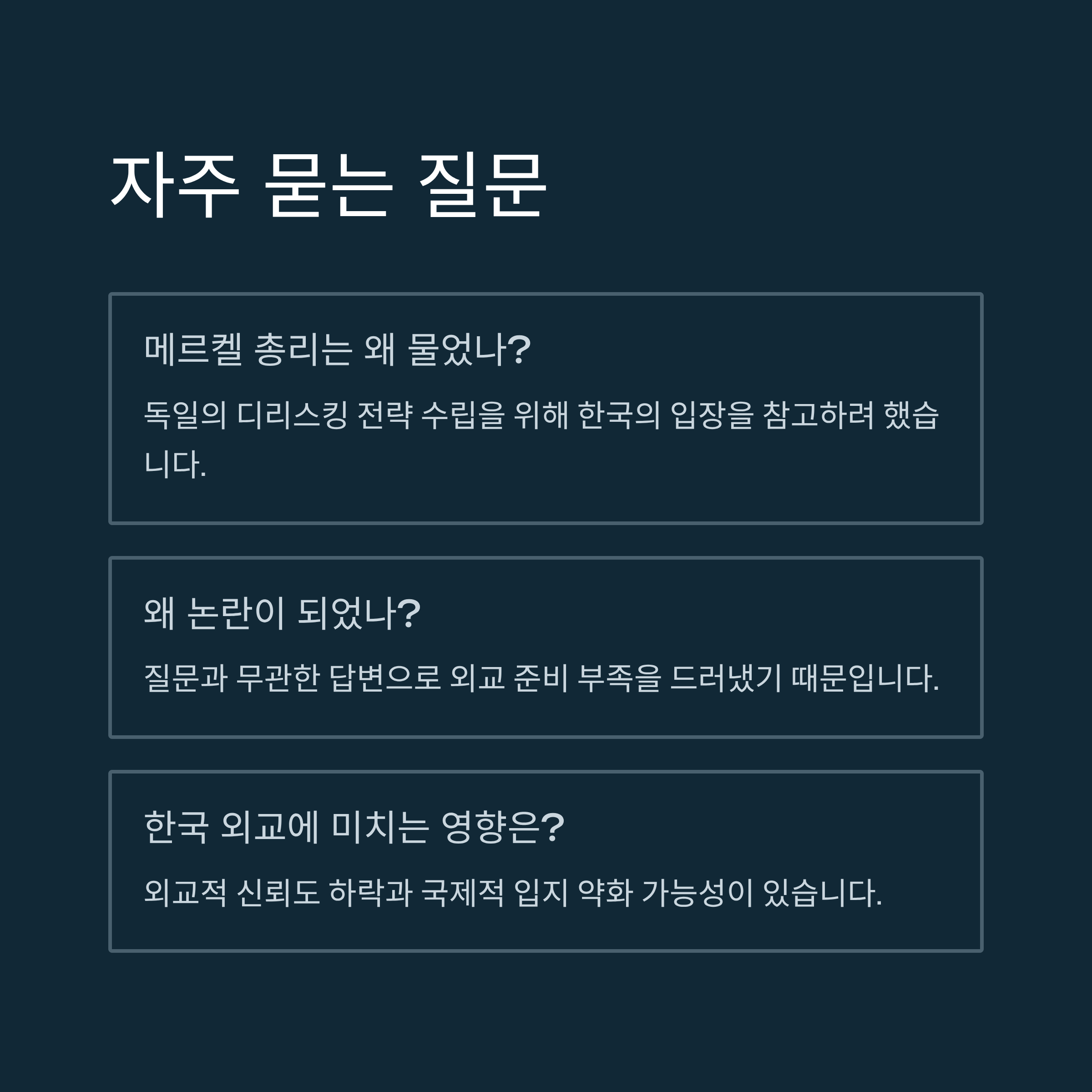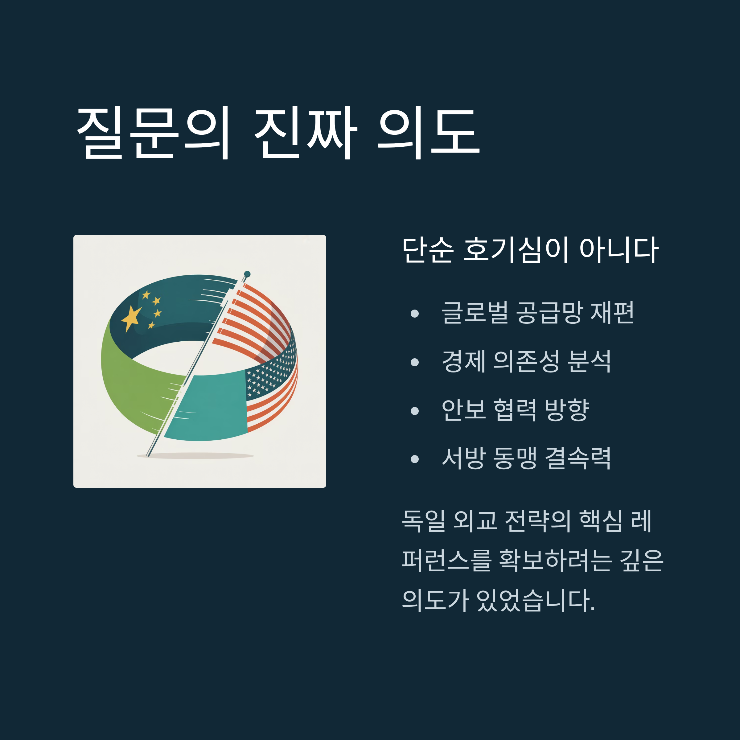 이러한 질문은 단순 호기심이 아니라, 글로벌 외교 환경 변화를 예의주시하고 독일의 국제 외교 전략 방향 설정에 중요한 레퍼런스를 확보하기 위한 깊은 의도가 숨어 있었습니다. 따라서 외교적 맥락에서 중요한 질문이었으며, 한국 대통령의 답변은 독일과의 외교 신뢰도 및 협력 수준의 윤곽을 결정하는 중요한 요소로 평가되었습니다.