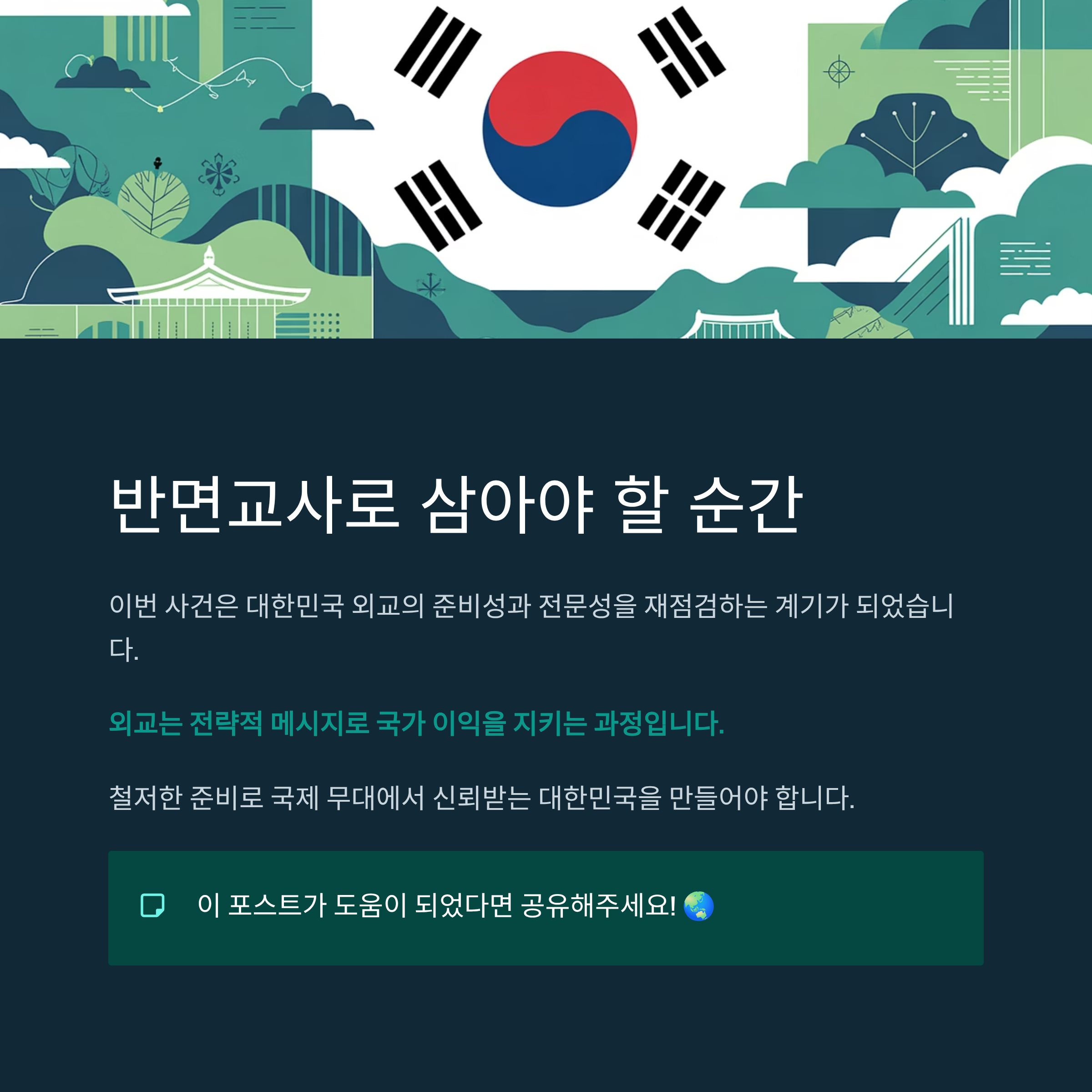 4. 이 사건으로 대한민국 외교 정책의 준비성과 방향성이 비판받는 결과로 이어졌습니다.