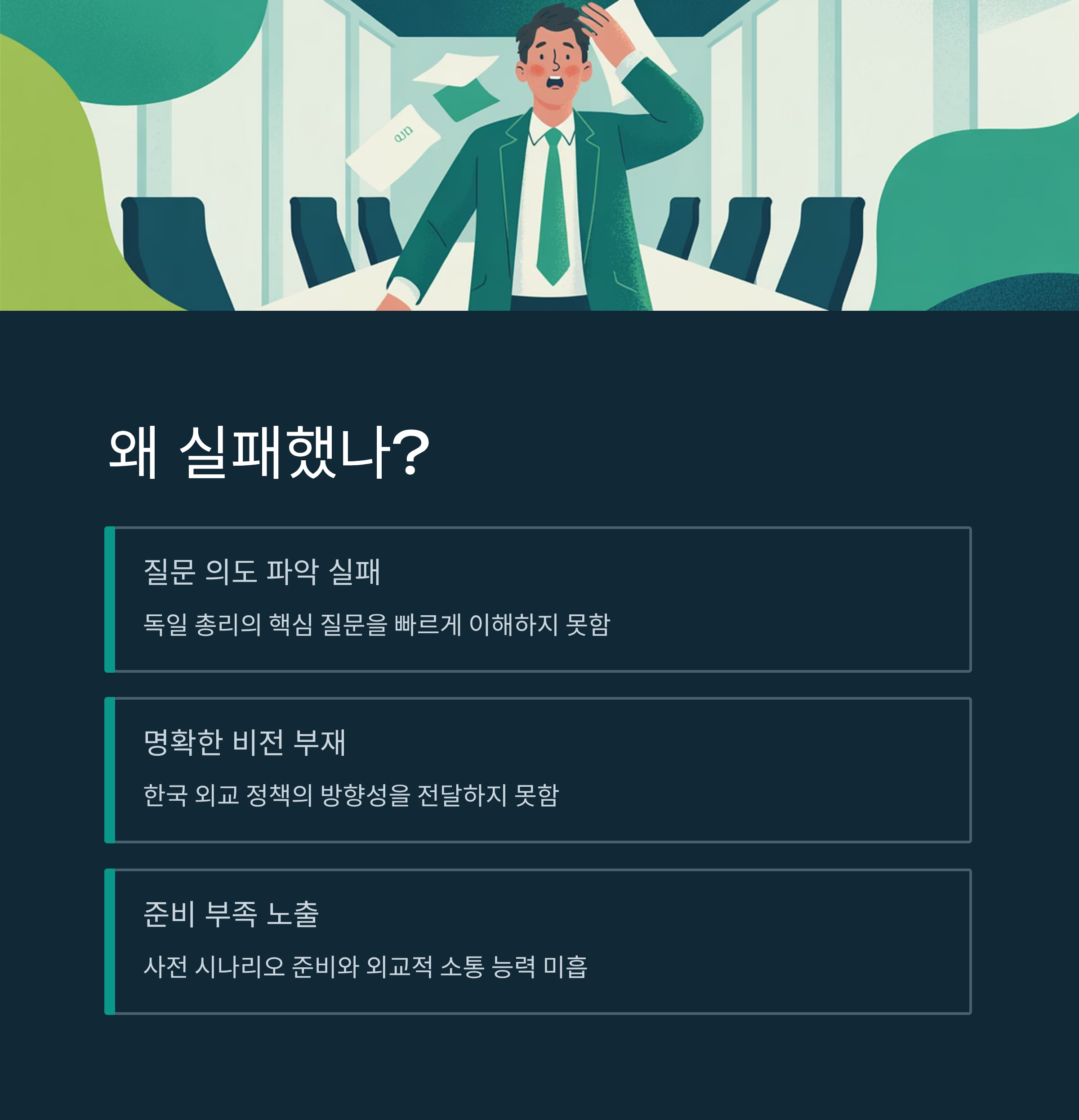 | A. 독일 총리의 직접적인 질문에 대해 맥락과 관련 없는 답변을 하며 대외적인 외교 준비 부족을 보여주었기 때문입니다. |