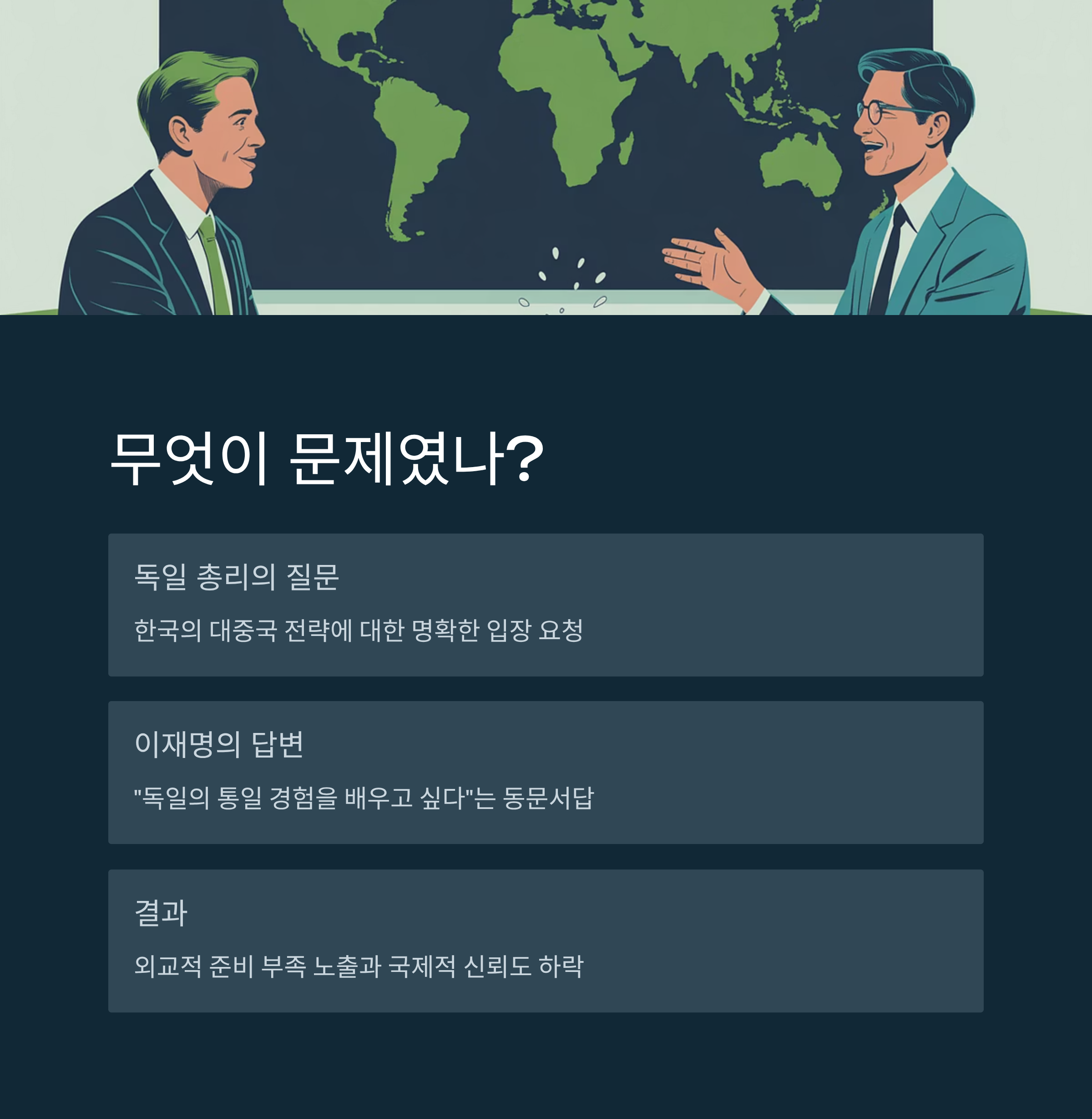 이재명 대통령의 답변 실책은 첫째, 질문의 핵심 의도를 빠르게 파악하지 못한 점, 둘째, 한국 외교 정책에 대한 명확한 방향성과 비전을 전달하지 못한 점에 있습니다. 독일 총리의 질문은 한국의 대중국 전략, 즉 글로벌 공급망, 경제 의존성, 안보 협력 등 광범위한 이슈를 포괄적으로 다룰 기회를 제공했지만, 이에 대해 '독일 통일 경험을 배우고 싶다'는 동문서답 성격의 발언은 준비 부족과 외교적 소통 능력 미흡을 그대로 드러내는 결과를 낳았습니다.