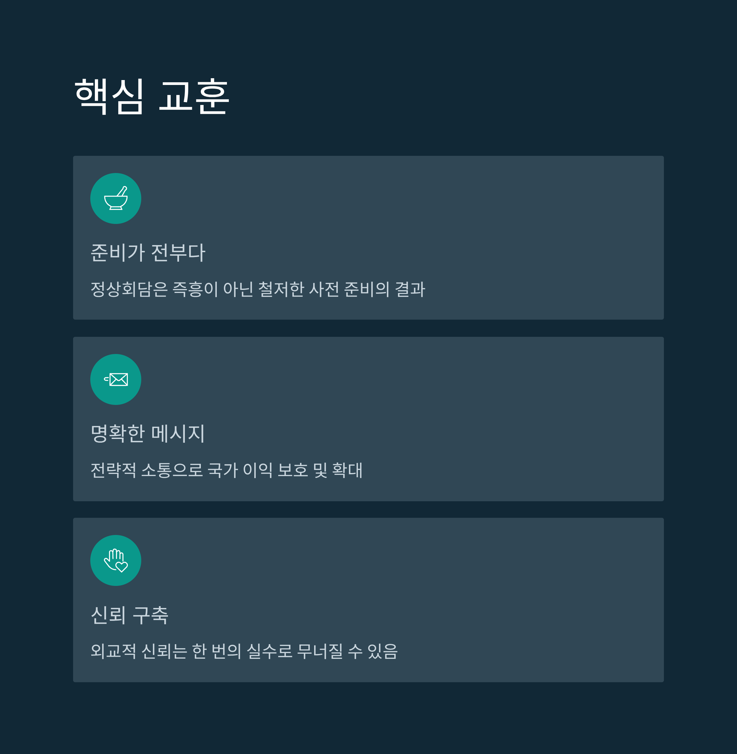 5. 전문가들은 국제 무대에서 철저한 사전 준비와 전략적 접근이 중요하다고 강조합니다.