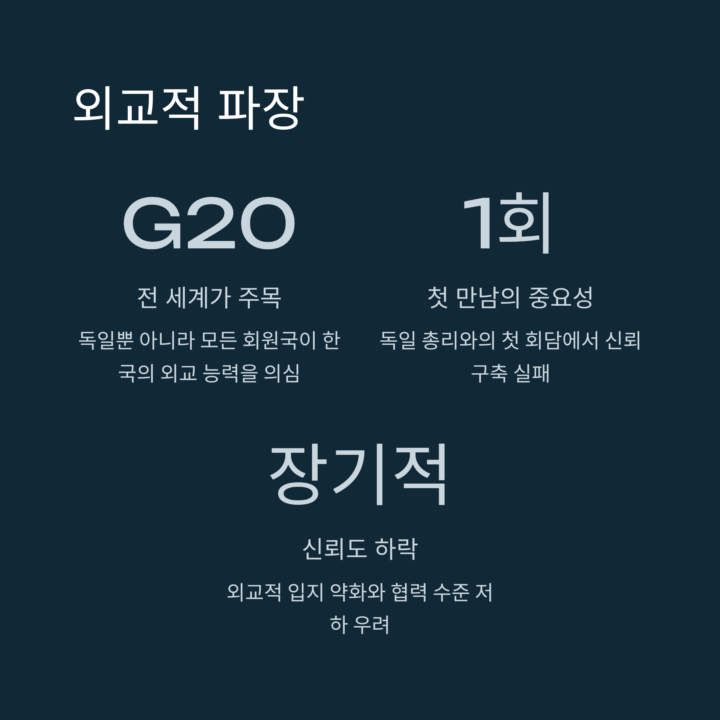 준비성 부족은 특히 정상 회담과 같은 중요한 국제 외교 자리에서는 치명적일 수 있습니다. 이는 독일뿐만 아니라 이를 주목한 다른 G20 국가들에게도 한국이 외교 문제를 다루는 방식을 의심하게 만들 수 있습니다.