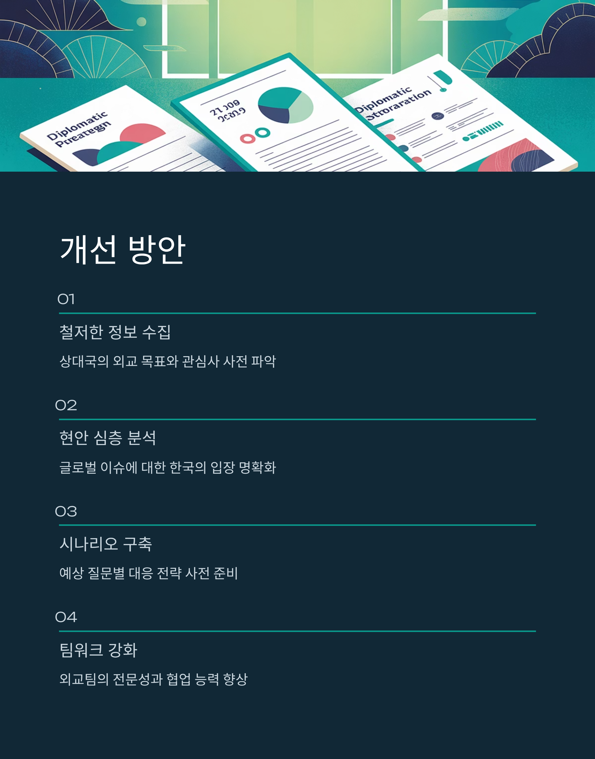 따라서 향후 대한민국은 보다 명확하고 일관된 대외 전략을 설정하고, 이를 국제사회에 효과적으로 전달할 필요가 있습니다. 특히 개별 이슈별로 지역적·세계적 맥락을 이해하고, 이에 따른 국가 이익을 극대화할 수 있는 외교적 준비와 팀워크가 중요합니다. 정상회의와 같은 국제적 자리에서는 특정 질문에 대응하기 위한 연습 및 시나리오를 사전에 철저히 준비하는 것이 필수적입니다.