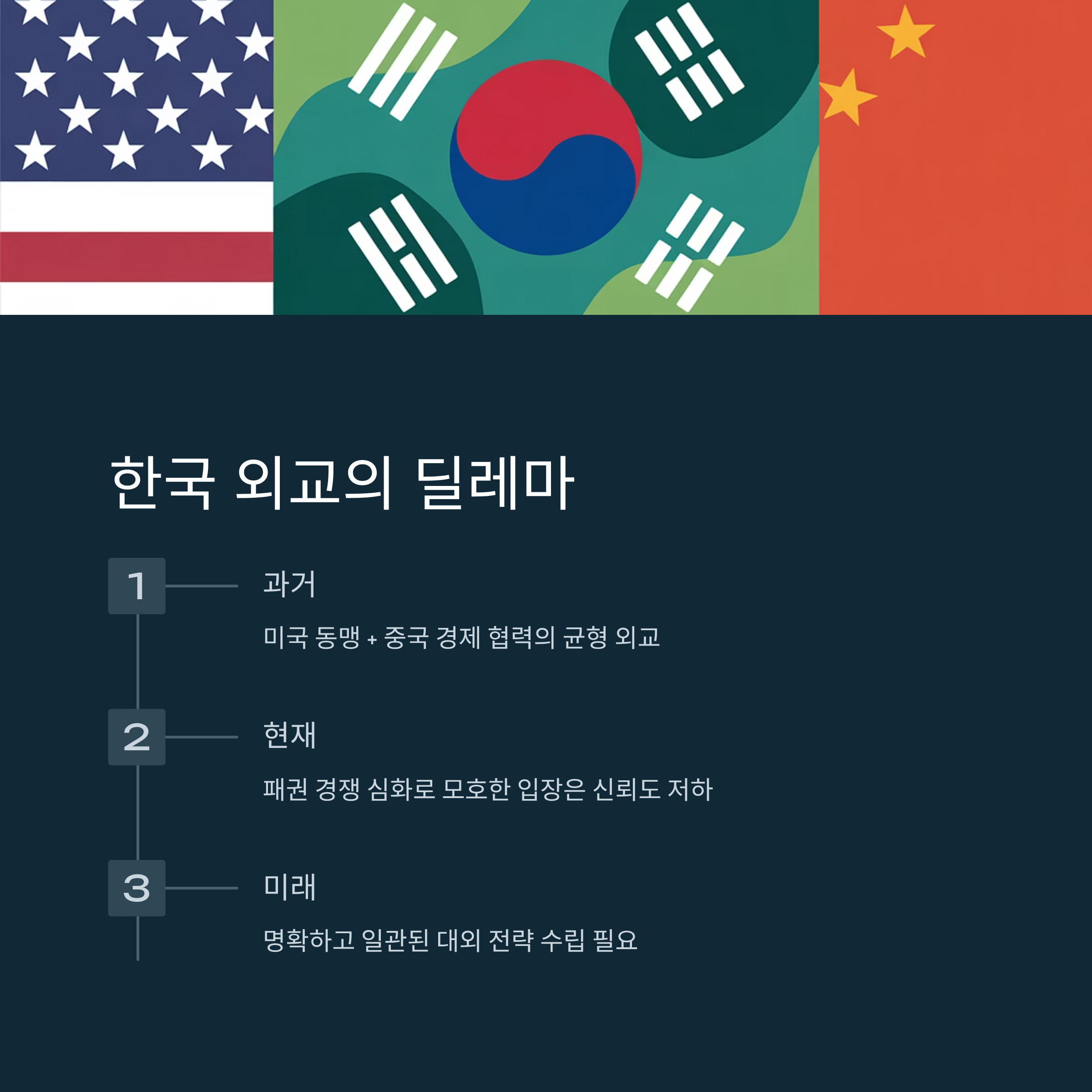 대한민국은 오랫동안 미국과의 동맹 관계를 유지하면서도 중국과의 일정 부분 경제적 협력을 지속해 왔습니다. 그러나 세계적인 패권 경쟁이 심화되는 상황에서, 중립적 외교 정책은 모호함으로 비칠 수 있습니다. 이는 대한민국의 외교적 신뢰도를 낮출 수 있습니다.