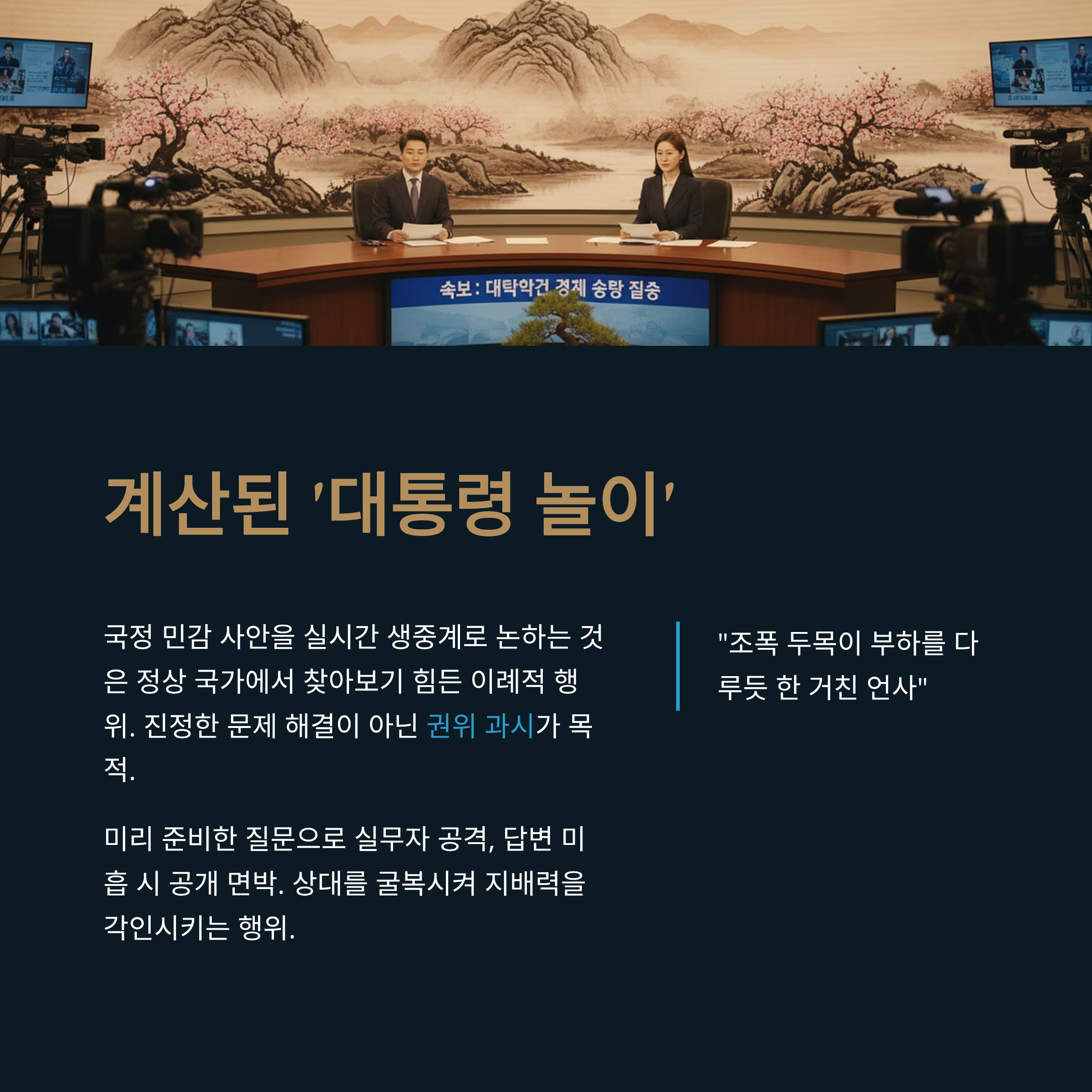 대통령이 미리 준비한 질문으로 실무자를 공격하고, 답변이 미흡하면 공개적으로 면박을 주는 행위는 상대를 굴복시켜 자신의 지배력을 국민에게 각인시키려는 '대통령 놀이'에 불과하다는 것입니다.