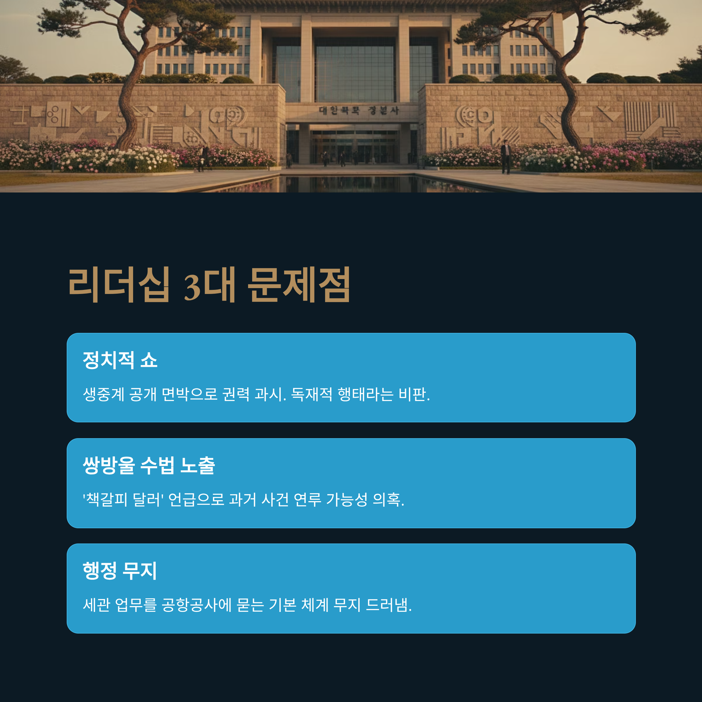 이재명 대통령의 인천공항공사 사장 공개 질타는 단순한 해프닝이 아니라, 그의 리더십에 내재된 심각한 문제점들을 압축적으로 보여준 사건입니다.