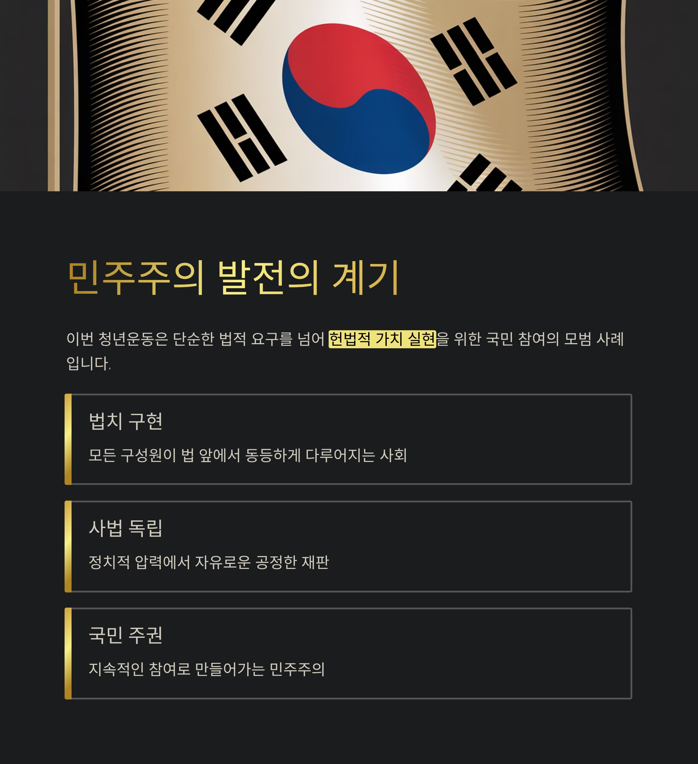 5. 이번 청년운동은 법치주의 원칙 회복과 사법 시스템에 부여하는 청년들의 메시지를 증폭하고 있습니다.