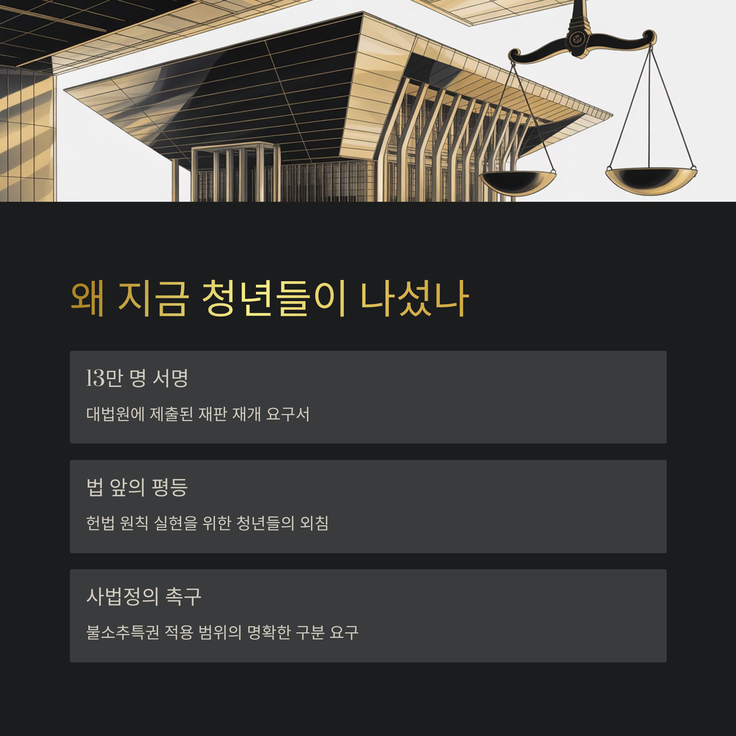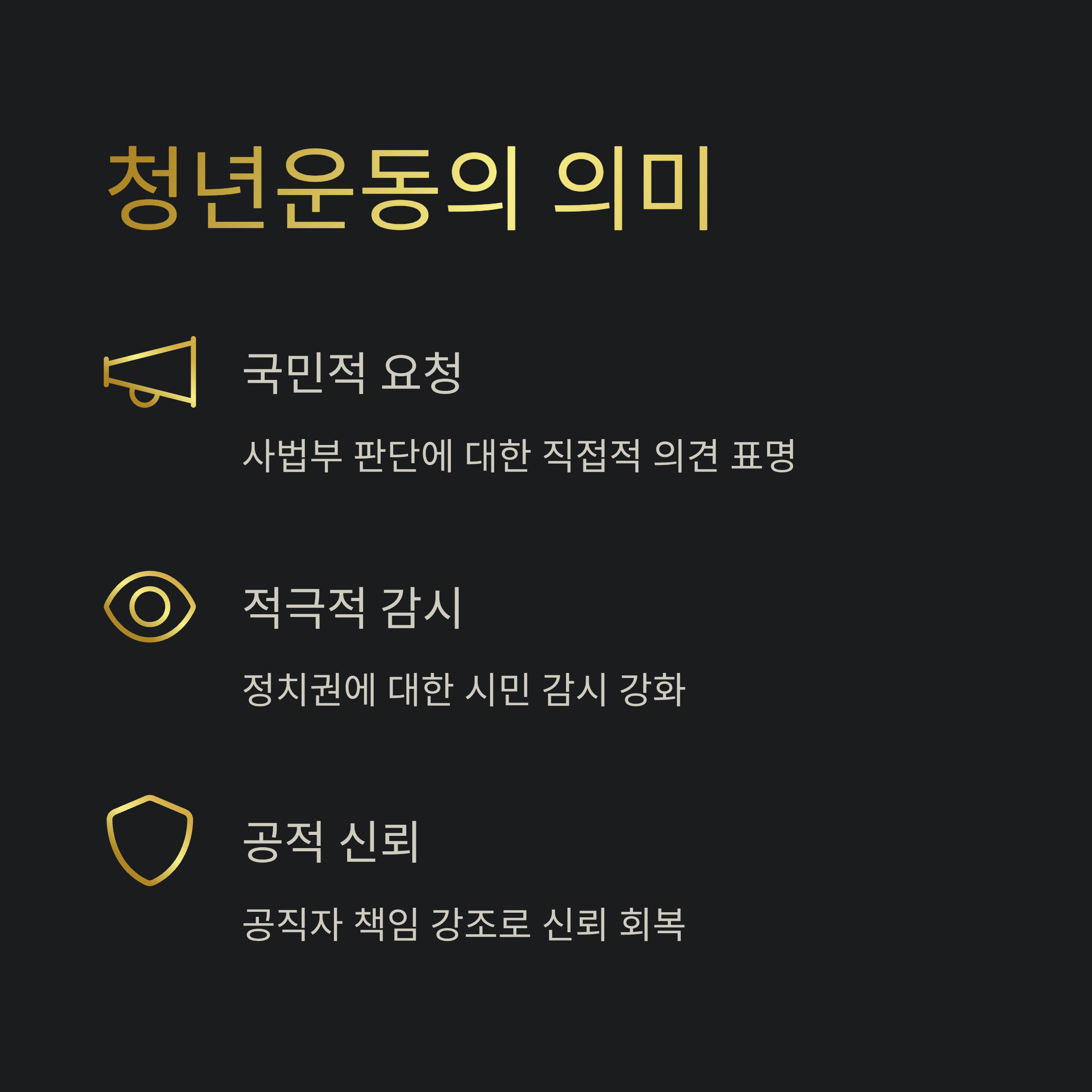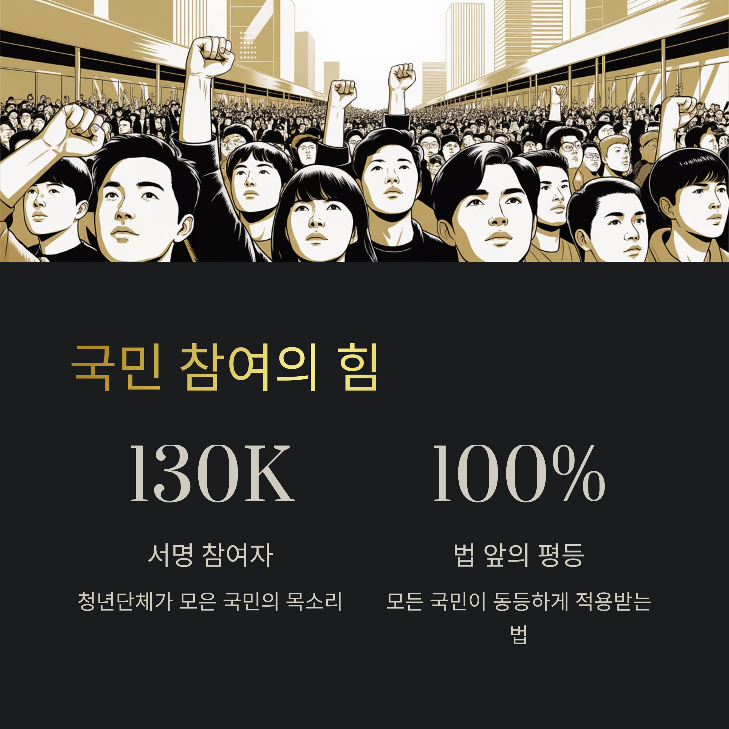이번 청년단체가 주도한 약 13만 명 서명 운동은 단순한 법적 요구를 넘어, 정치와 사법 시스템의 정의 구현을 요구하는 의미가 담겨 있습니다. 특히 법 앞의 평등 원칙에 기반하며, 공직자의 책임을 강조한 점에서 공적 신뢰 회복에 중요한 메시지를 전달하고 있습니다. 대법원에 제출된 서명은 사법부의 판단에 대한 직접적인 국민적 요청으로 작용하며, 정치권에 대한 시민의 적극적 감시가 강화되고 있음을 보여줍니다.
