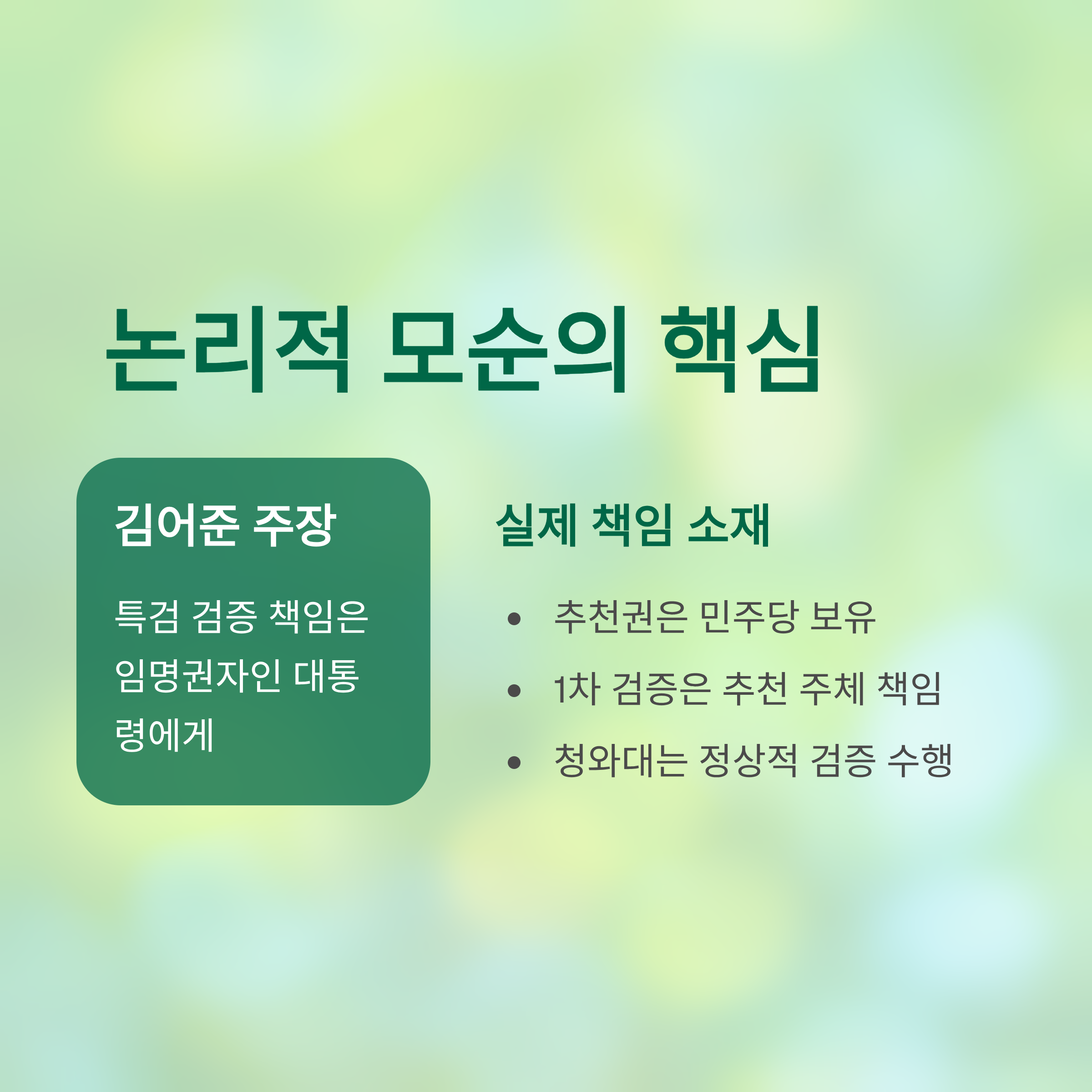 또한, 김어준은 특검 후보의 부실 검증 책임을 추천 주체인 당이 아닌 인사권자인 대통령과 청와대에 전가하는 논리적 모순을 보였습니다.