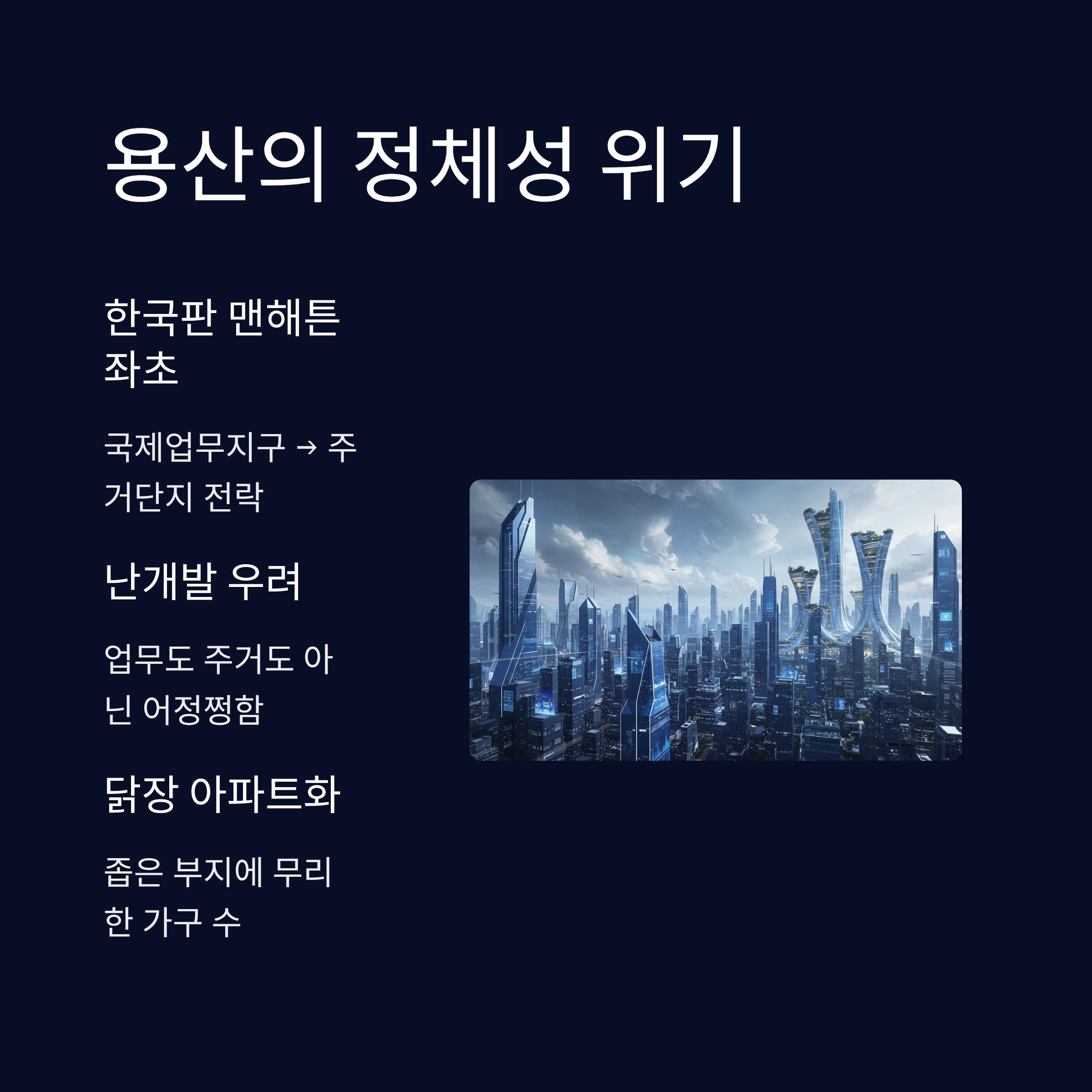 | 용산 국제업무지구 | '한국판 맨해튼' 계획 대신 1만 가구 주택 공급 강행 시 난개발 우려, 서부이촌동 교통 마비 예상 |