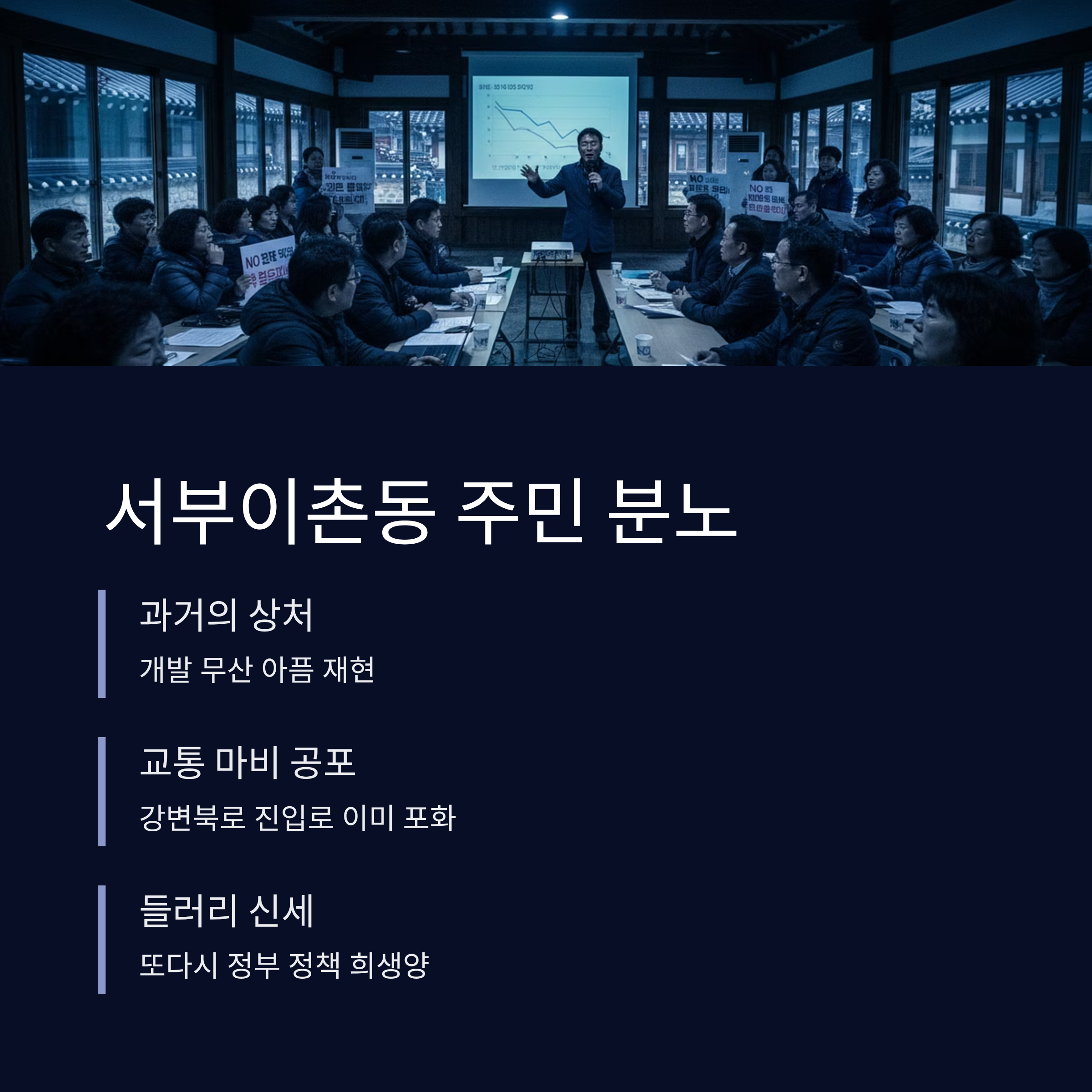용산 정비창 부지는 당초 국제적인 비즈니스 허브, 즉 '한국판 맨해튼'으로 개발될 예정이었으나, 정부가 주택 공급을 위해 1만 가구를 밀어 넣으면서 지역 정체성이 모호해졌습니다. 업무 지구도 주거 지구도 아닌 어정쩡한 개발은 도시 경쟁력을 떨어뜨릴 뿐만 아니라, 좁은 부지에 무리하게 가구 수를 늘릴 경우 주거 환경이 열악한 '닭장 아파트'로 전락할 가능성이 큽니다. 특히 서부이촌동은 현재도 강변북로 진입로 등으로 인한 교통 정체가 심각한 곳인데, 인프라 확충 없이 대규모 인구가 유입될 경우 교통 마비가 우려되며, 주민들은 또다시 정부 정책의 들러리가 되었다며 분통을 터뜨리고 있습니다.