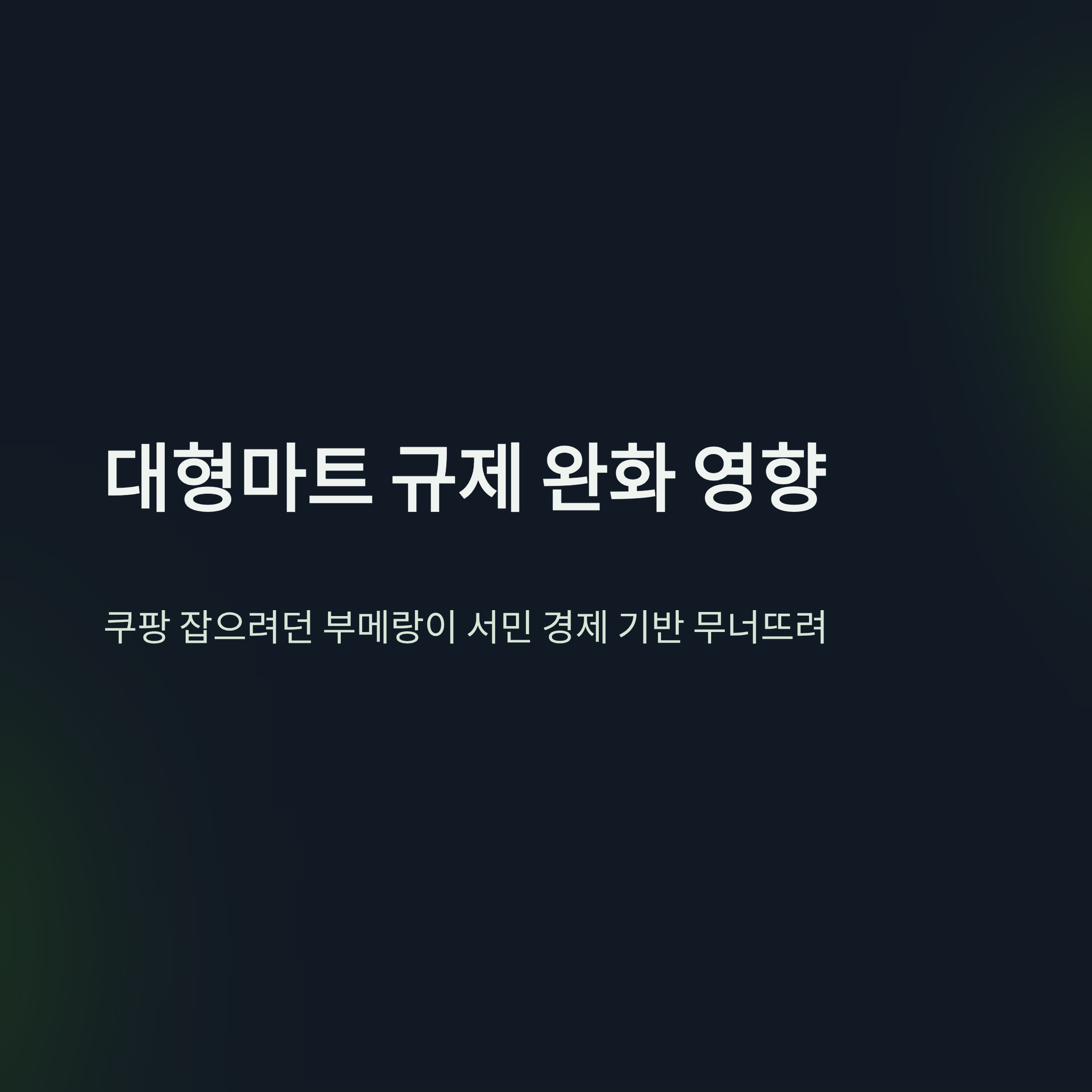 | A. 대형마트가 새벽배송뿐만 아니라 심야 배송, 24시간 물류센터 운영까지 가능해지면 소비자의 대형마트 의존도가 더욱 높아집니다. 이렇게 되면 동네 슈퍼마켓이나 전통시장을 찾던 수요마저 대형마트 배송으로 흡수되어, 이미 높은 공실률로 고통받는 골목상권의 붕괴가 가속화될 전망입니다. |