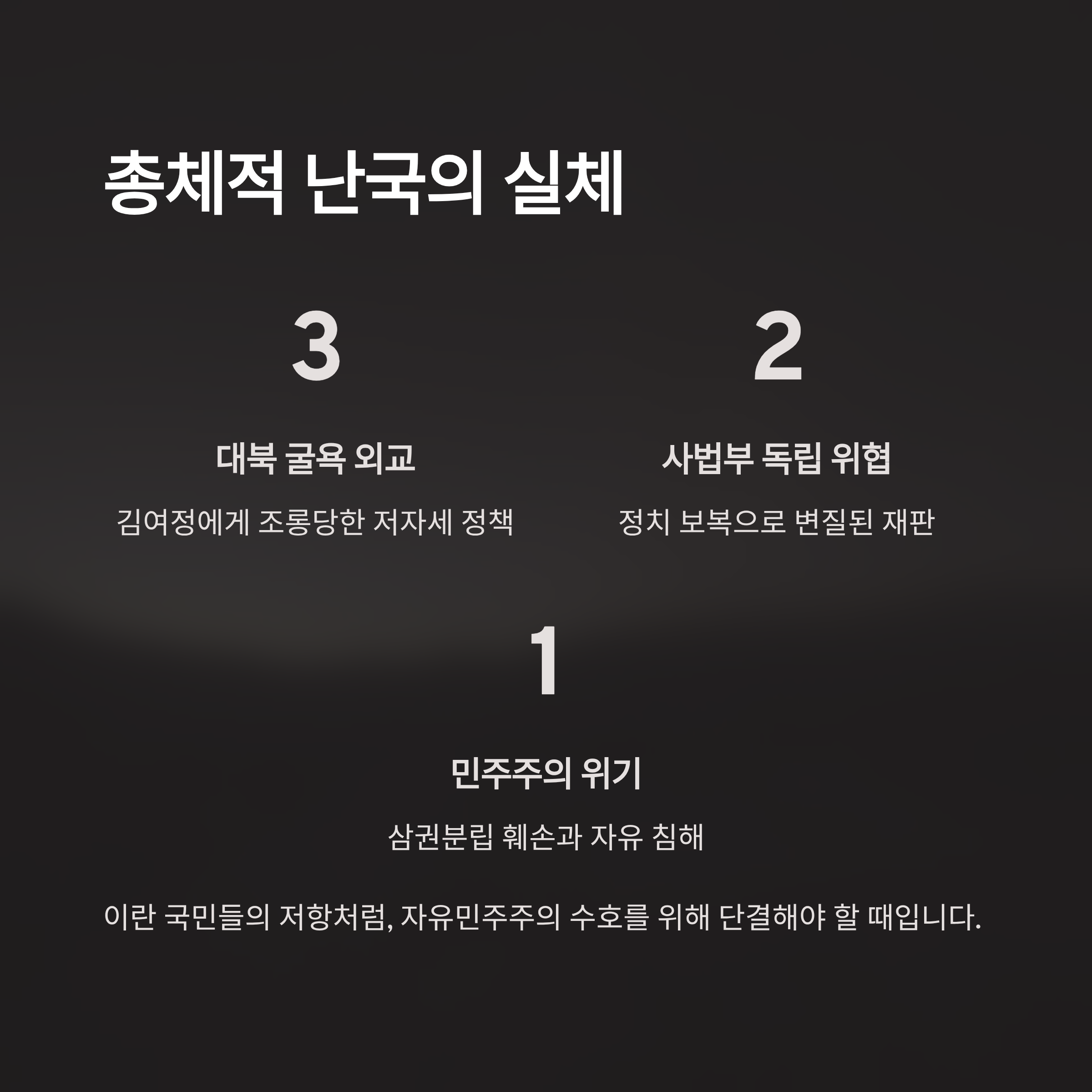 이재명 정부의 총체적 난국이 드러나고 있습니다. 대북 굴욕 외교는 조롱으로 돌아왔고, 전직 대통령에 대한 정치 보복은 사법부 독립을 위협하는 수준에 이르렀습니다. 이러한 상황 속에서 국민의힘이 한동훈이라는 내부 분란 요소를 제거한 것은 매우 시의적절한 결정입니다. 이는 당의 결속을 다지고 정권에 맞설 동력을 재정비하는 중요한 전환점이 될 것입니다. 이란 국민들의 저항처럼, 우리도 자유민주주의를 수호하기 위해 더욱 단결하고 처절하게 싸워야 할 때입니다.