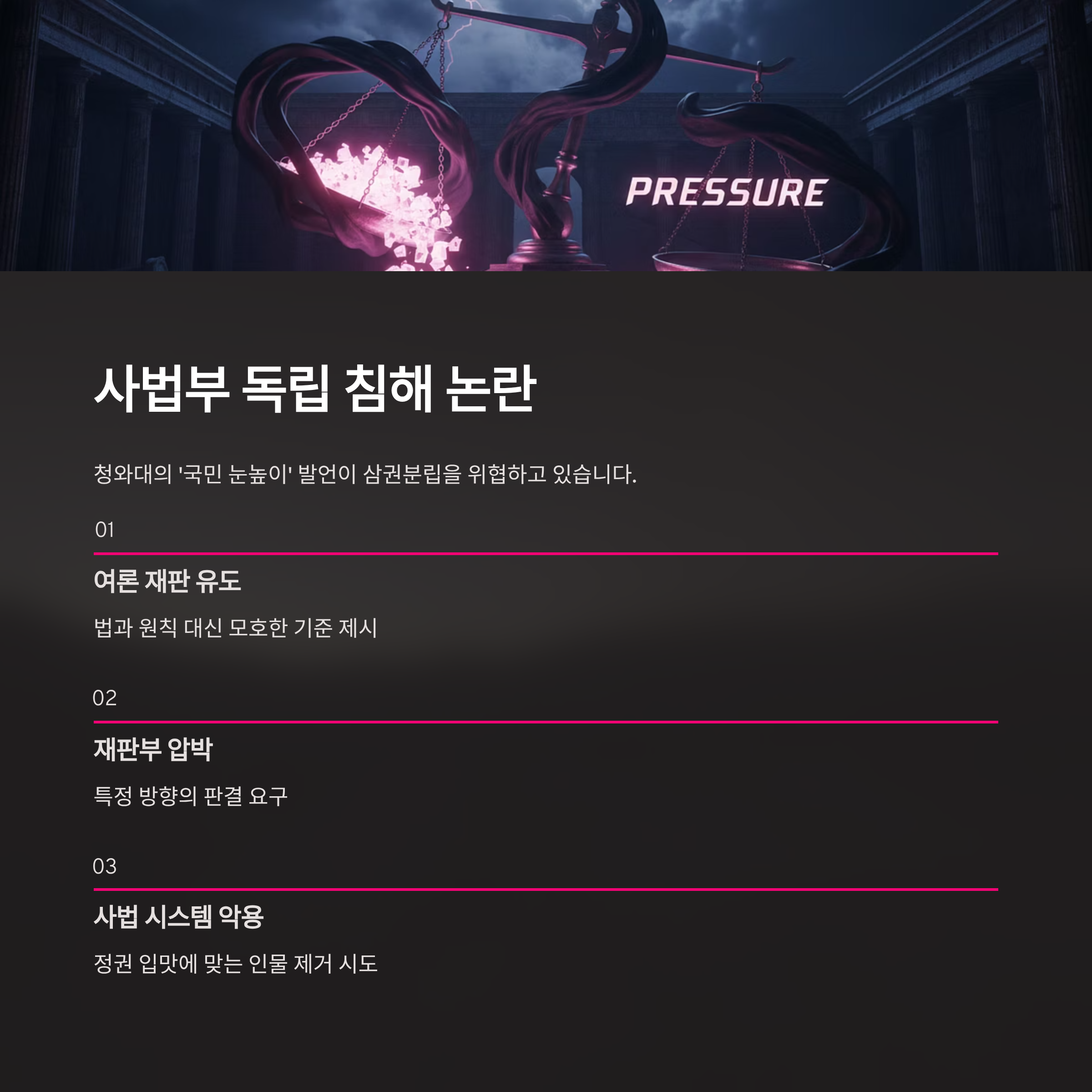 | Q. 윤석열 전 대통령 재판을 두고 사법부 압박 논란이 이는 이유는 무엇인가요? |