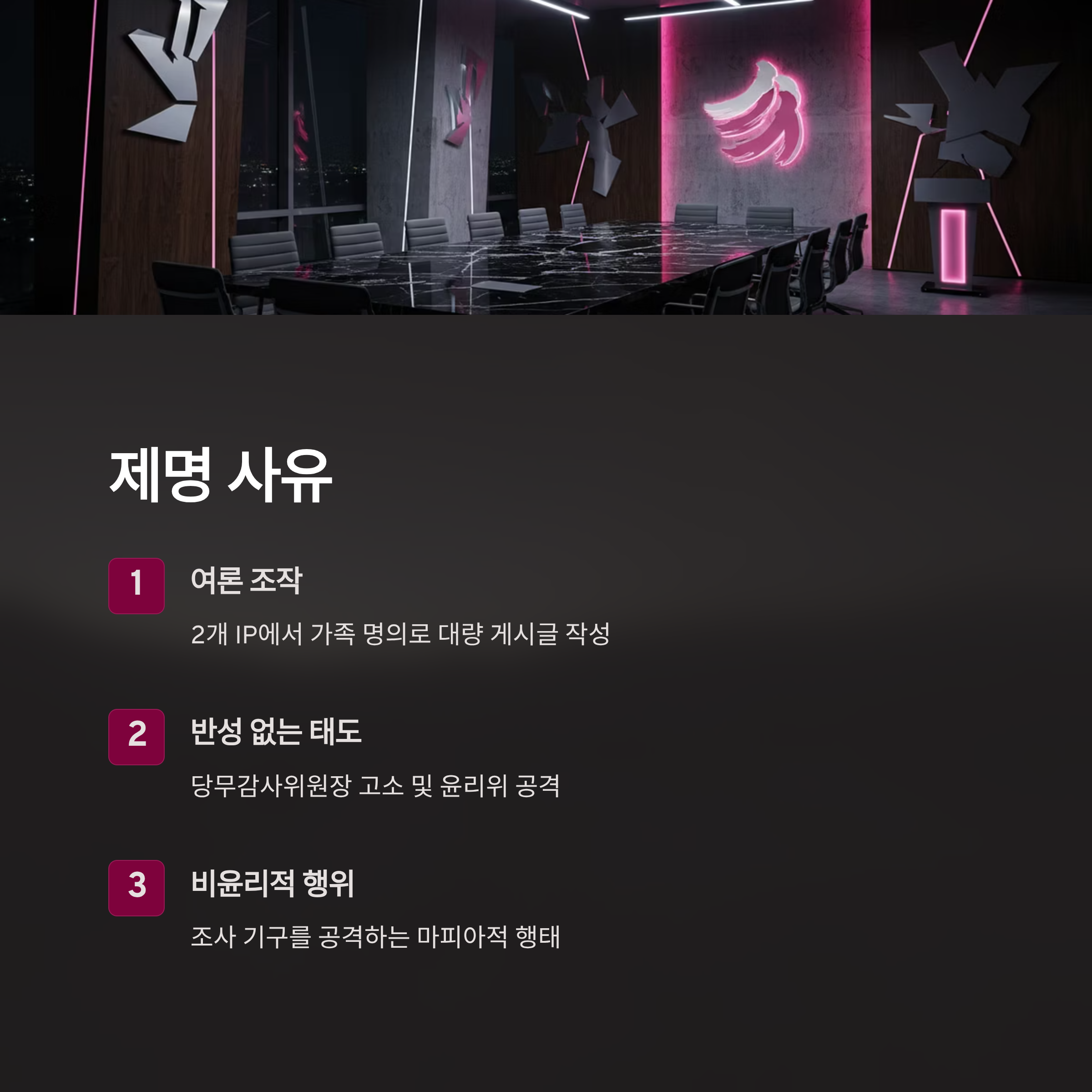 | A. 당원 게시판에 가족 명의 아이디로 여론 조작성 글을 다수 게시했다는 의혹에 대한 정치적, 윤리적 책임을 물은 것입니다. 특히 의혹을 부인하며 당무감사위원장을 고소하고 윤리위를 공격하는 등 반성 없는 태도가 중징계의 결정적 사유가 되었습니다. |