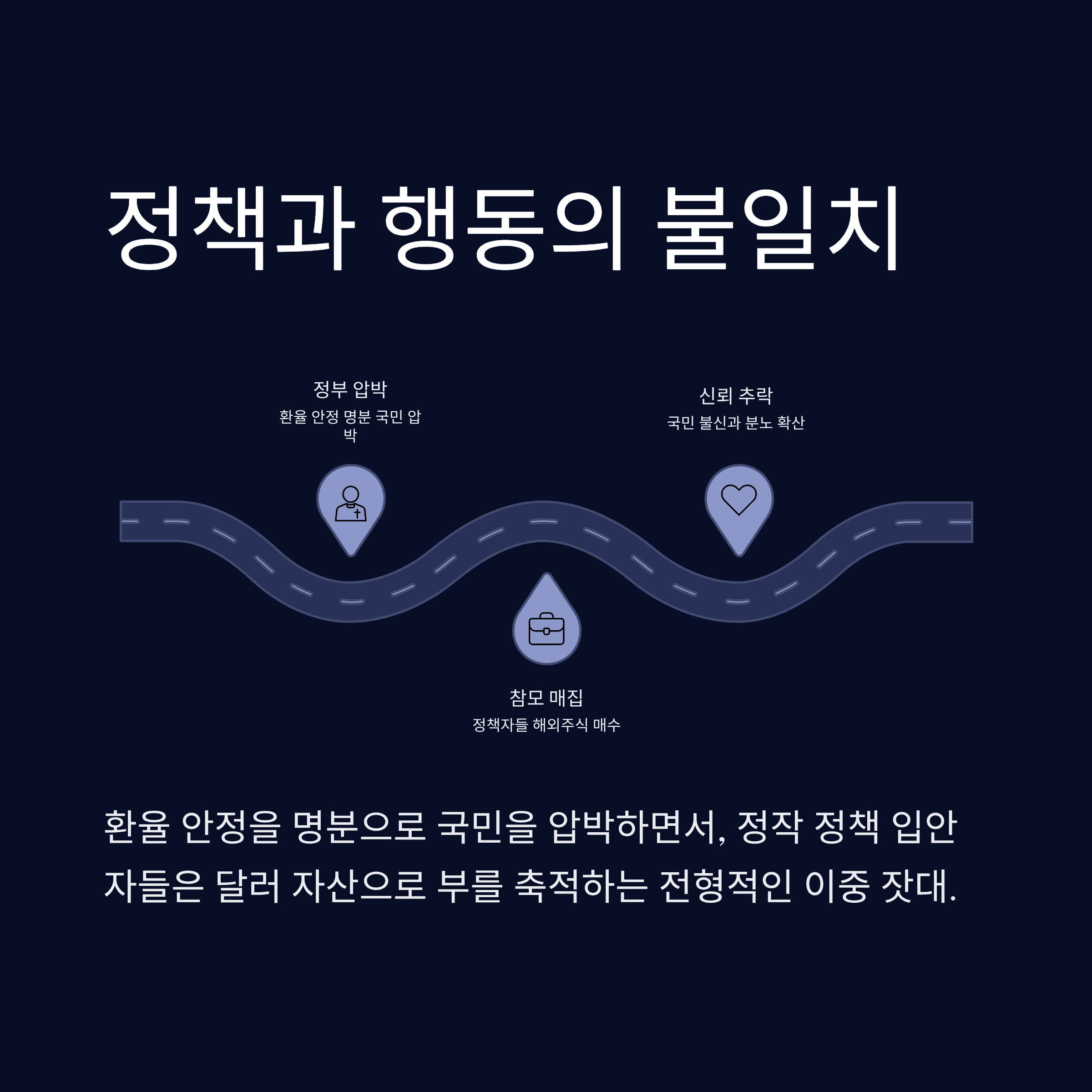 정부는 환율 안정을 위해 증권사의 해외 주식 마케팅을 축소시키고 한국은행 총재가 해외 투자자들에게 경고성 발언을 하는 등 '서학개미'를 압박해 왔습니다. 그러나 정작 청와대 참모진의 재산 공개 내역은 이들이야말로 '왕개미'임을 보여줍니다. 이장형 법무비서관 일가의 94억 원대 테슬라 보유나, 노재헌 주중대사의 엔비디아 1만 7,500주 보유 등은 일반 개인 투자자는 상상하기 힘든 규모입니다. 이는 "환율 위기는 국민 탓"이라면서 자신들은 강달러의 수혜를 입는 전형적인 '내로남불' 행태로, 정부의 국장 부양 의지에 대한 진정성을 의심하게 만드는 결정적인 근거가 되고 있습니다.