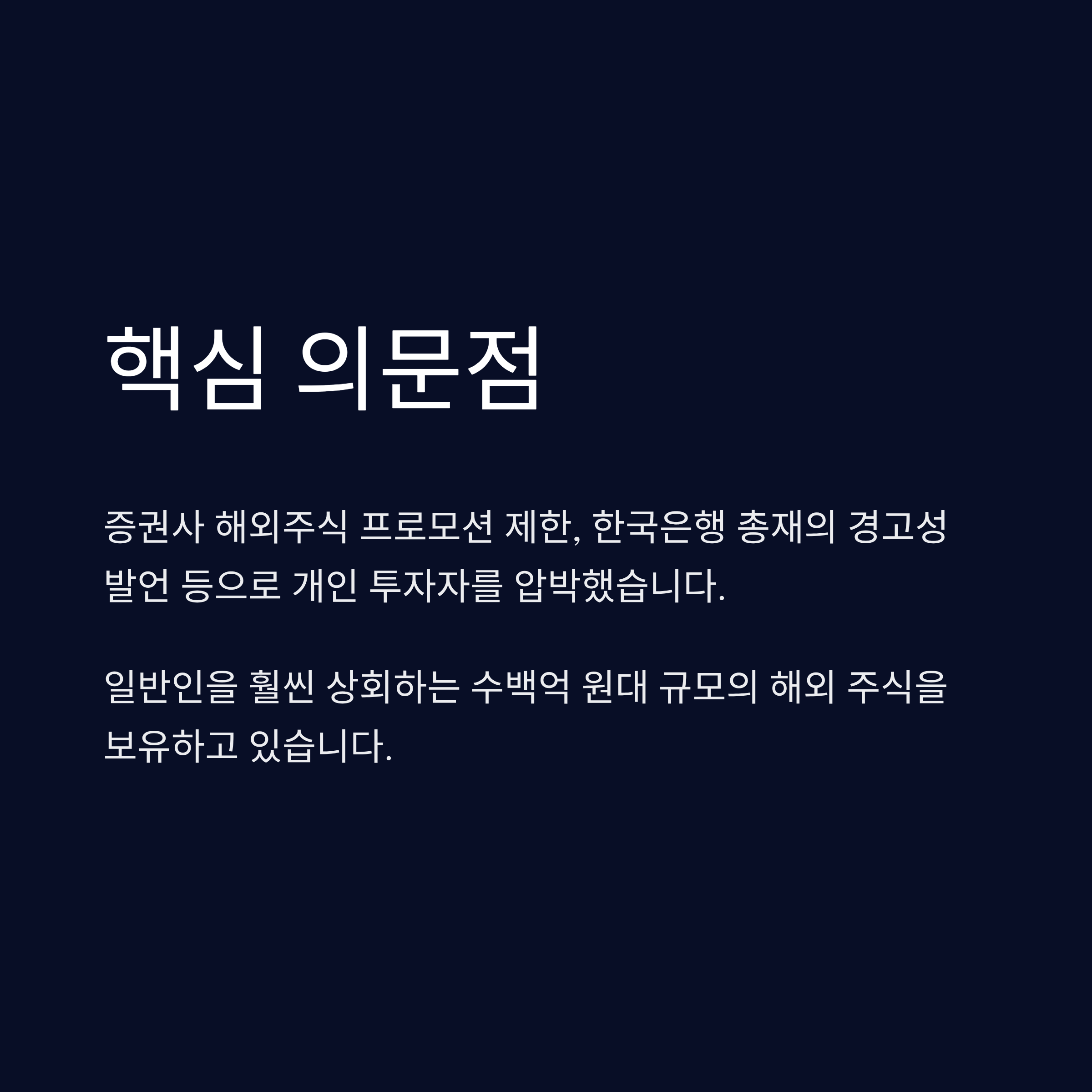 | A. 정부는 환율 방어를 위해 증권사의 해외 주식 프로모션을 제한하고, 한국은행 총재가 해외 투자자들을 향해 부정적인 발언을 하는 등 개인의 달러 유출을 문제 삼았습니다. 또한 경제 위기론에 대해 정책 실패가 아닌 국민들의 해외 투자 확대가 환율 상승의 주원인이라는 논리를 펴왔습니다. |