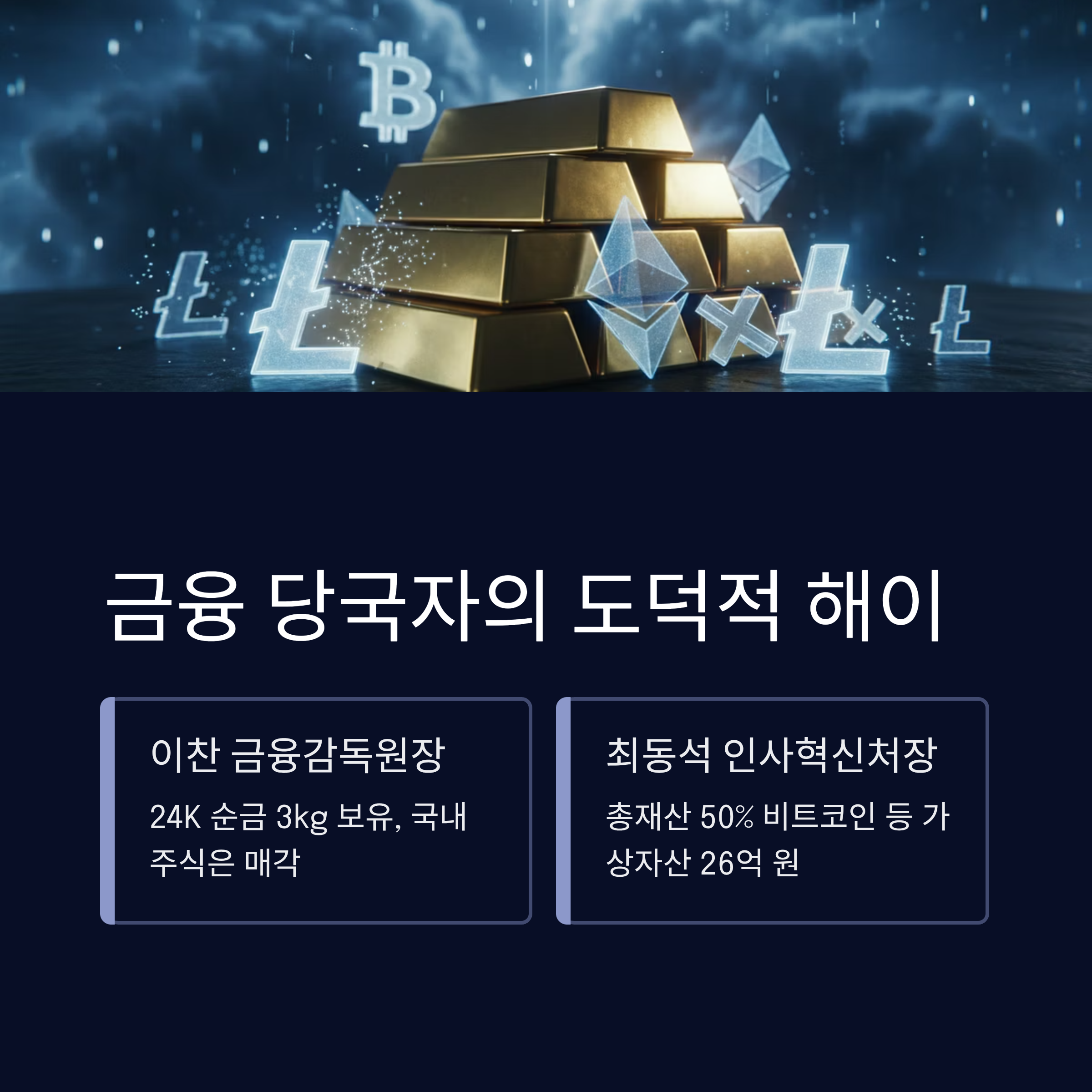 금융 정책을 총괄하고 감시해야 할 인사들의 자산 운용 또한 도마 위에 올랐습니다. 이재명 대통령의 사법연수원 동기인 이찬 금융감독원장은 이해충돌 방지를 이유로 국내 주식은 처분했지만, 안전자산인 순금 3kg을 보유해 빈축을 샀습니다. 더 큰 문제는 가상자산입니다. 최동석 인사혁신처장은 총재산의 절반에 달하는 26억 원을 변동성이 큰 코인에 투자하고 있었으며, 과거 코인 논란의 중심이었던 김남국 역시 여전히 '남국 토큰', '노무현 코인' 등을 포함해 12억 원 규모의 코인을 보유 중인 것으로 확인되었습니다. 공직 기강을 확립해야 할 인사처장이 투기성 자산에 몰두하는 모습은 공직 사회 전반의 모럴 해저드를 보여줍니다.